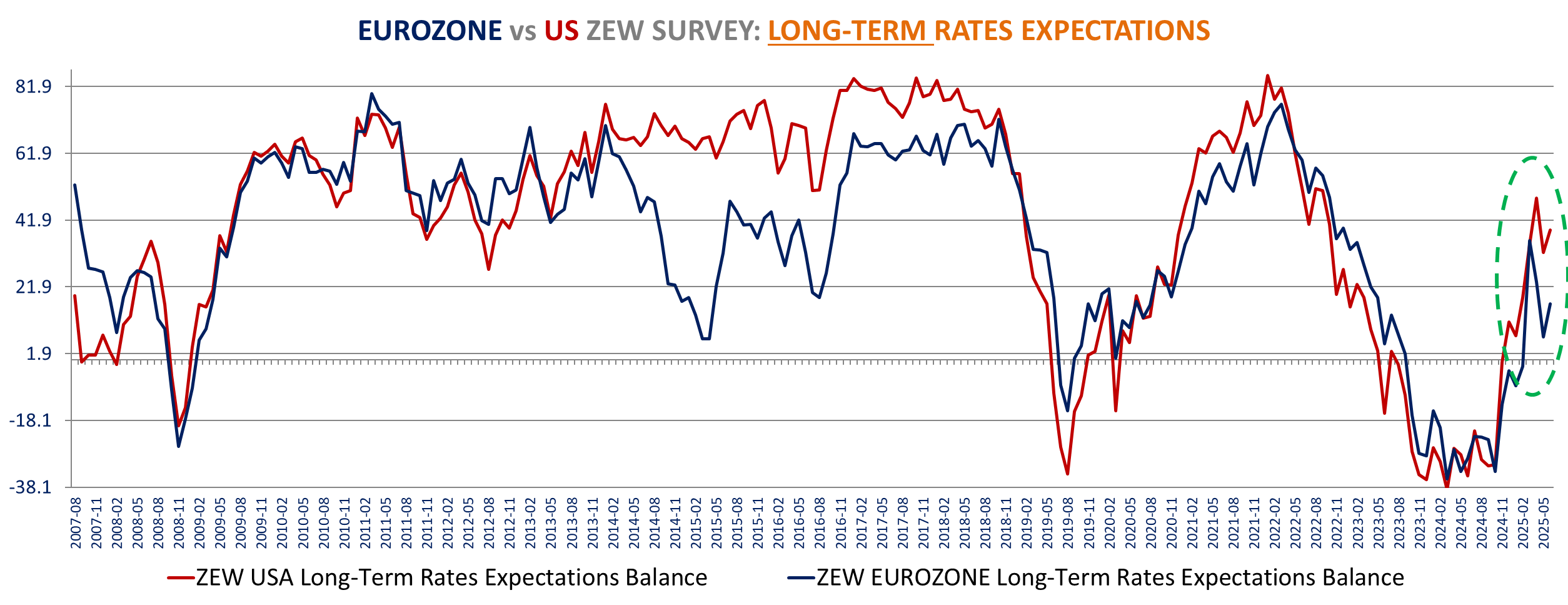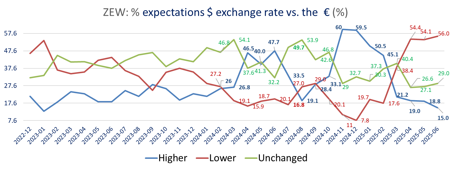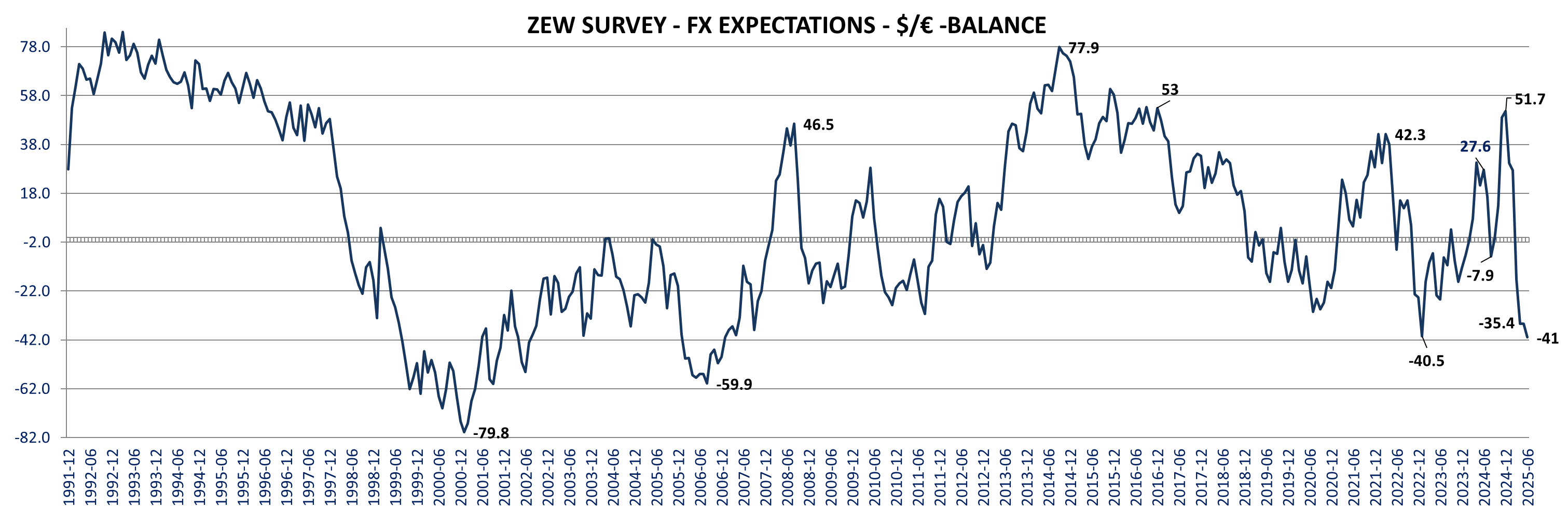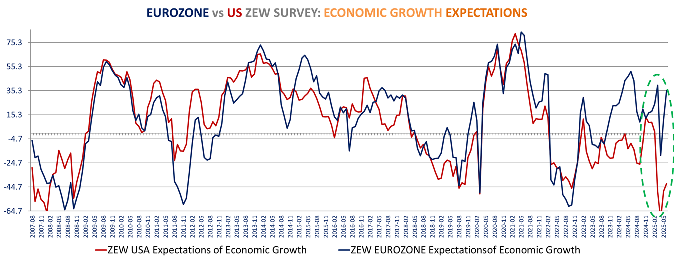 Sharp improvement in the Eurozone ZEW survey in June: Current assessment is up +11.7 points to -30.7 the best in more than 2 years (May 2023) and expectations surged +23.7 points to +35.3, almost back to the pre-tariff March level and far above consensus expectations of 23.5 (Trading economics).