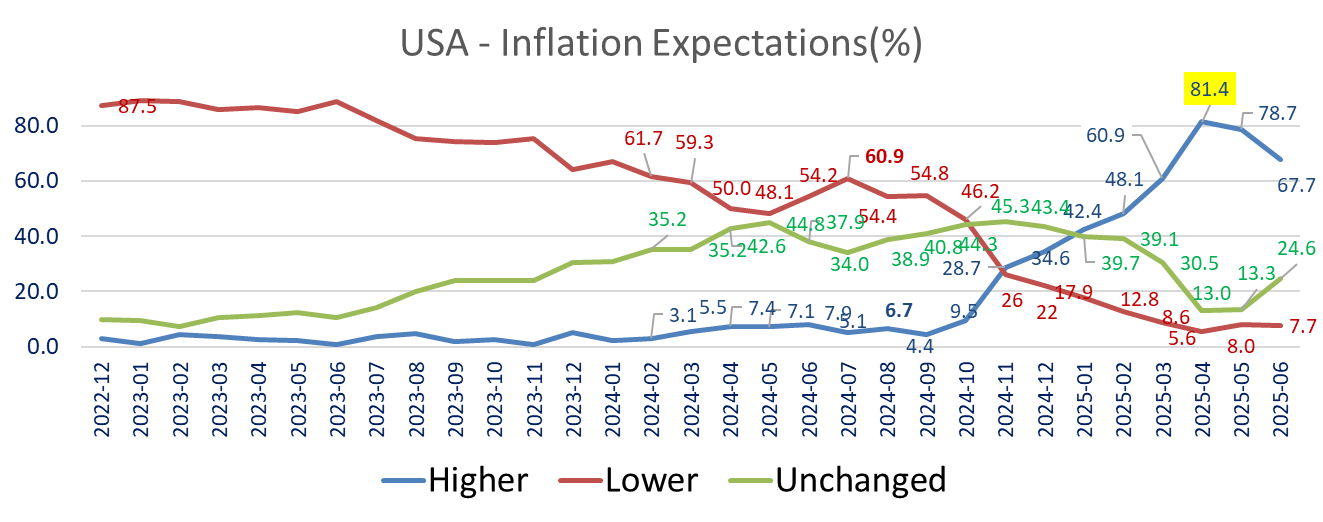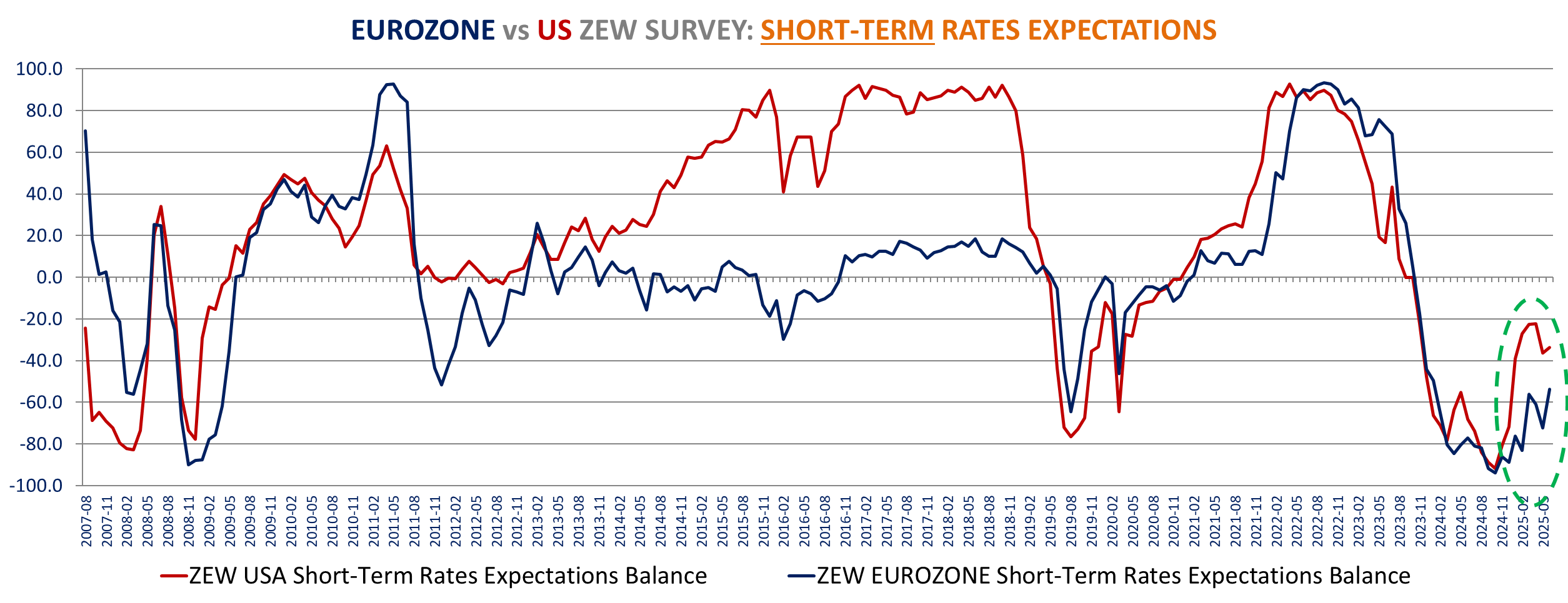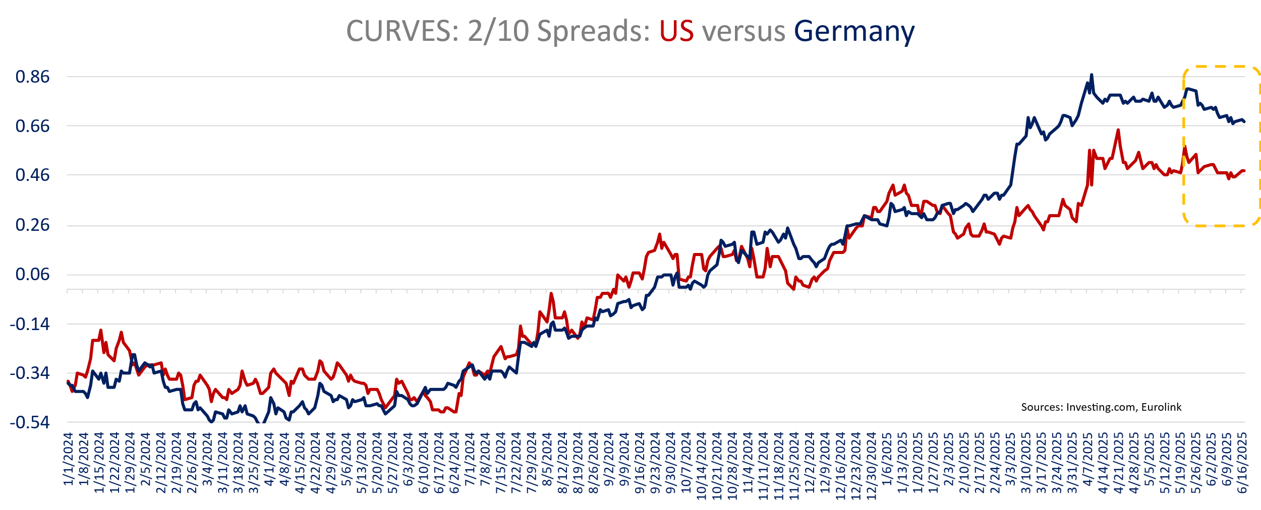 Sharp improvement in the Eurozone ZEW survey in June: Current assessment is up +11.7 points to -30.7 the best in more than 2 years (May 2023) and expectations surged +23.7 points to +35.3, almost back to the pre-tariff March level and far above consensus expectations of 23.5 (Trading economics).