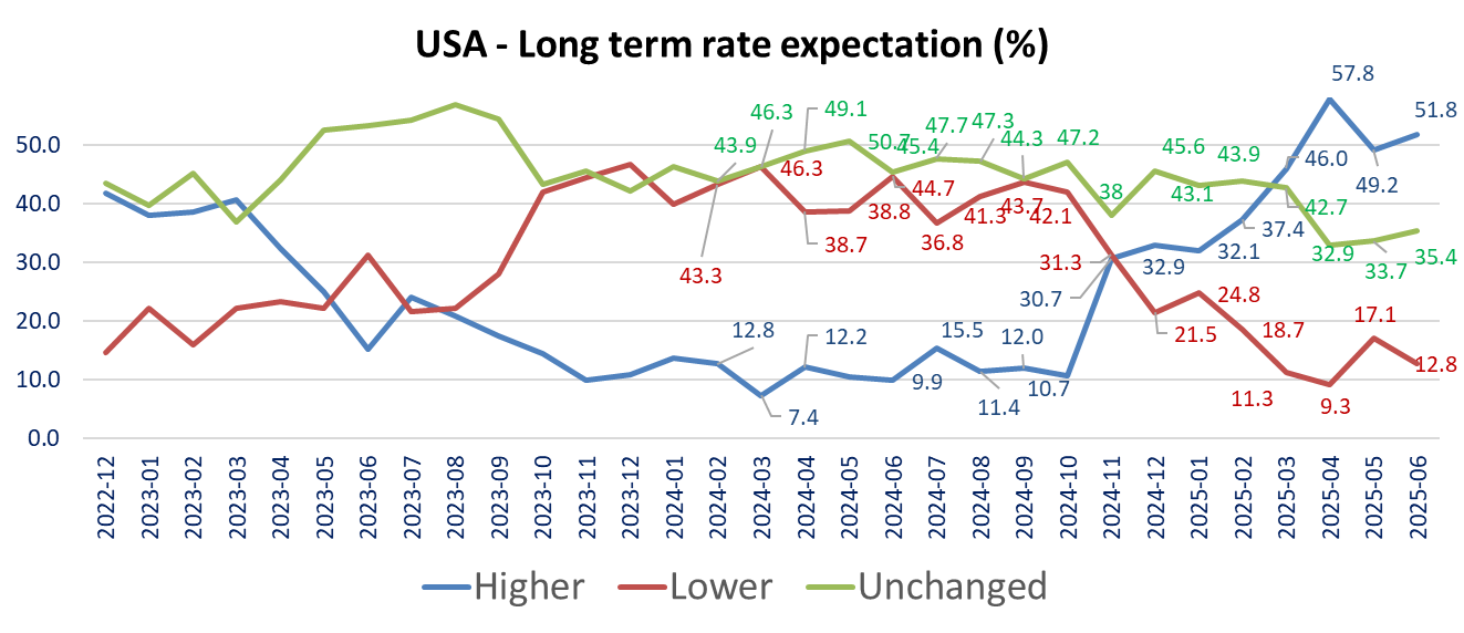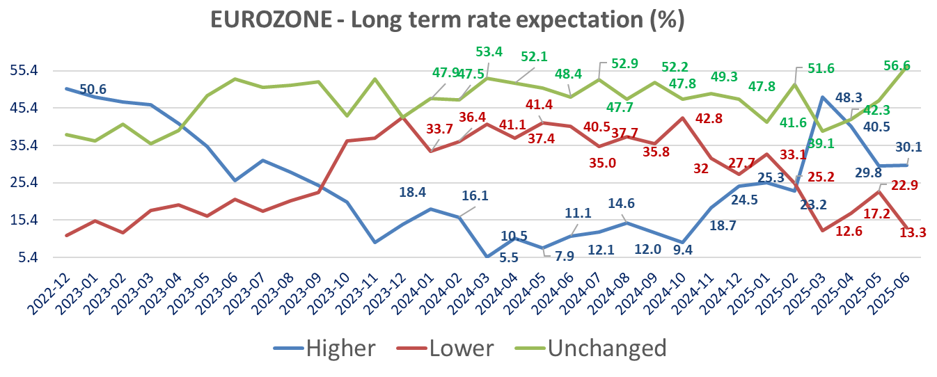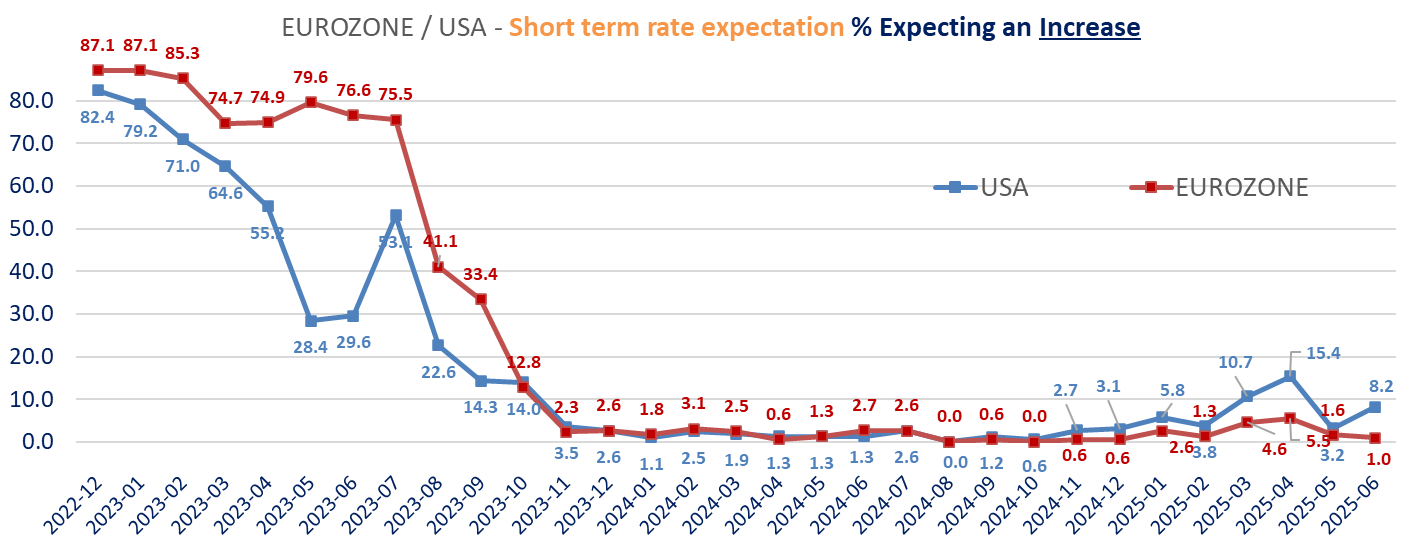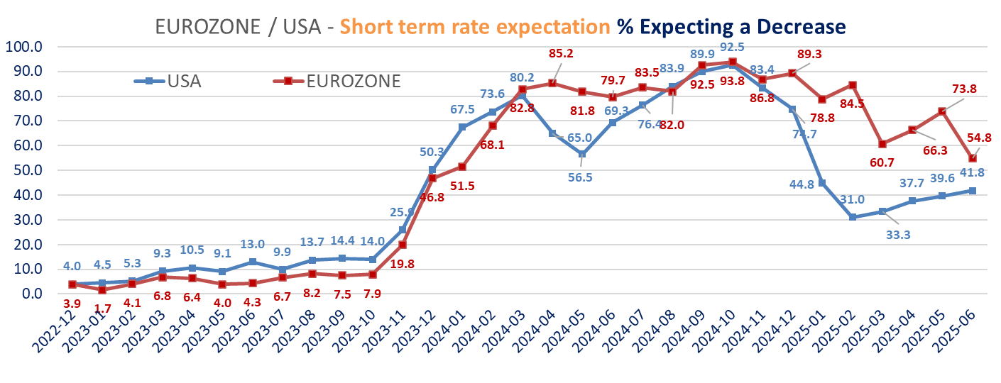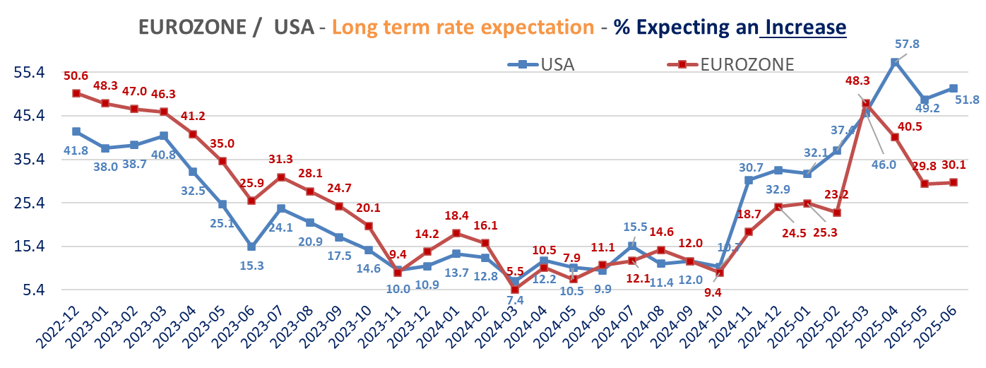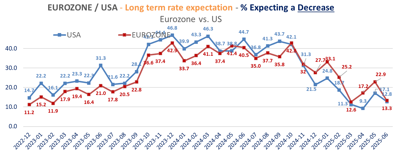 The ZEW survey’s details shows than investors sentiment toward the dollar is the weakest since December 2006 in June (with 56% expect a weaker $ vs. the €, up from 54.1), but it also shows a increase in inflation expectations in Europe, lower in the US, lower rate cuts expectations in Eurozone more investors seeing lower short term rates in the US. Investors’ long-term rates expectations are higher for both regions but with different dynamics between the two regions. More expect higher rates in the US, 51.8% up from 49.2%. For Germany, less expect a decrease (13.3% vs 22.9%) while 30.1% see an increase barely changed from 29.8% in May.
