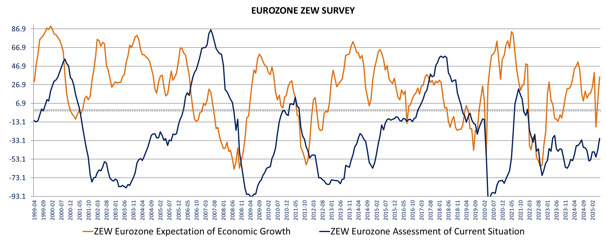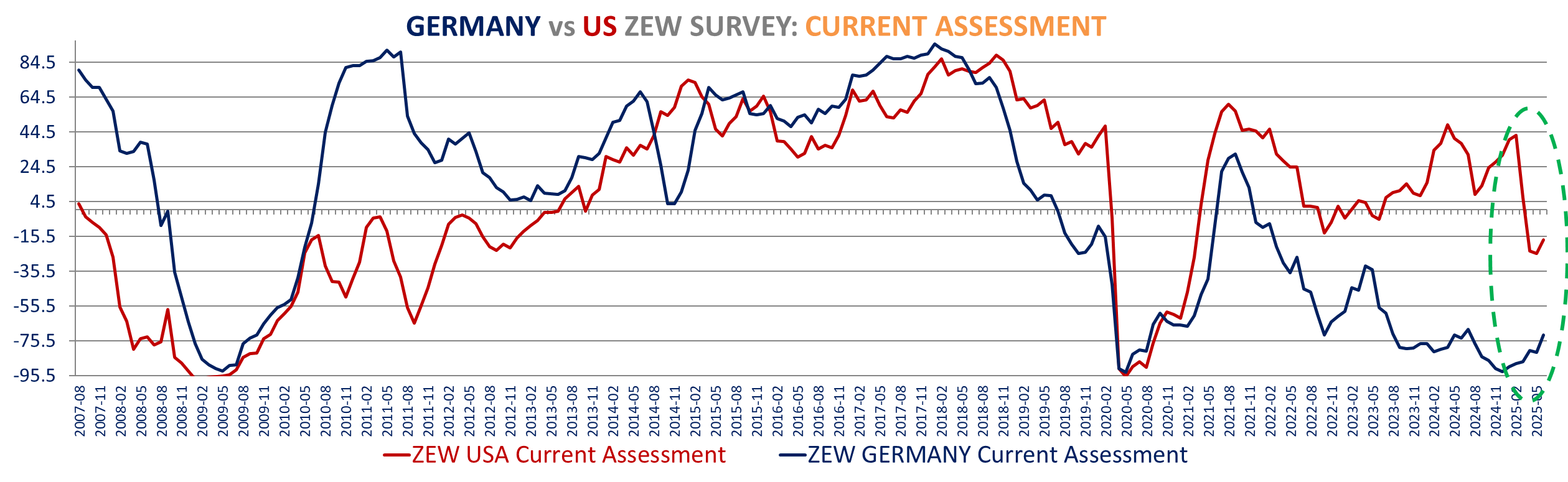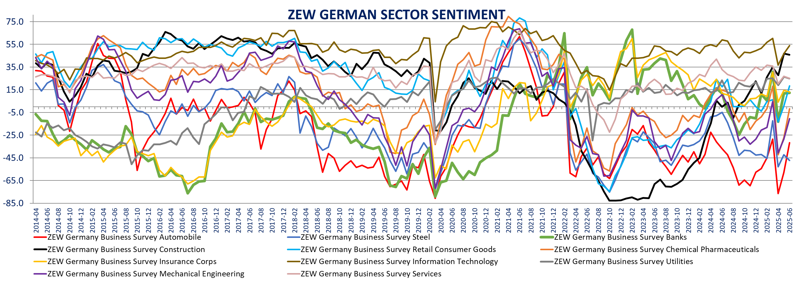 Germany current assessments are up 10 points to -72 best since July 2024 and expectations increase +22.3 points to +47.5 also best since March also above expectations of 35. ZEW Release, ZEW table.