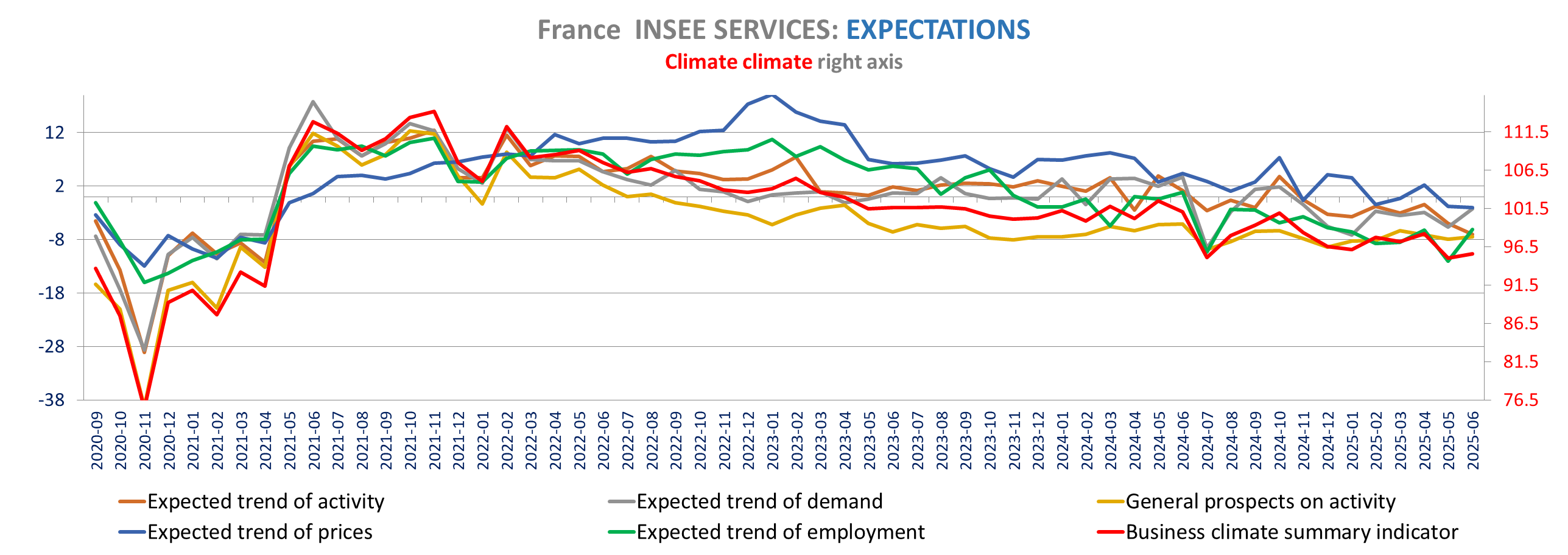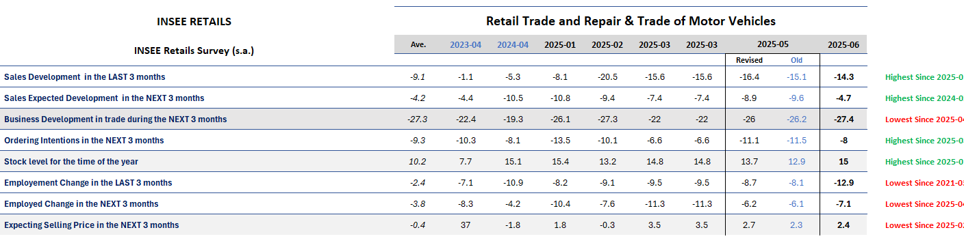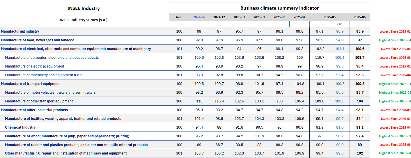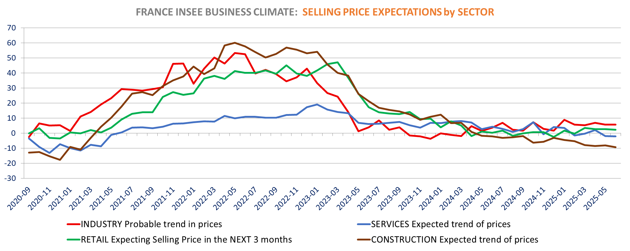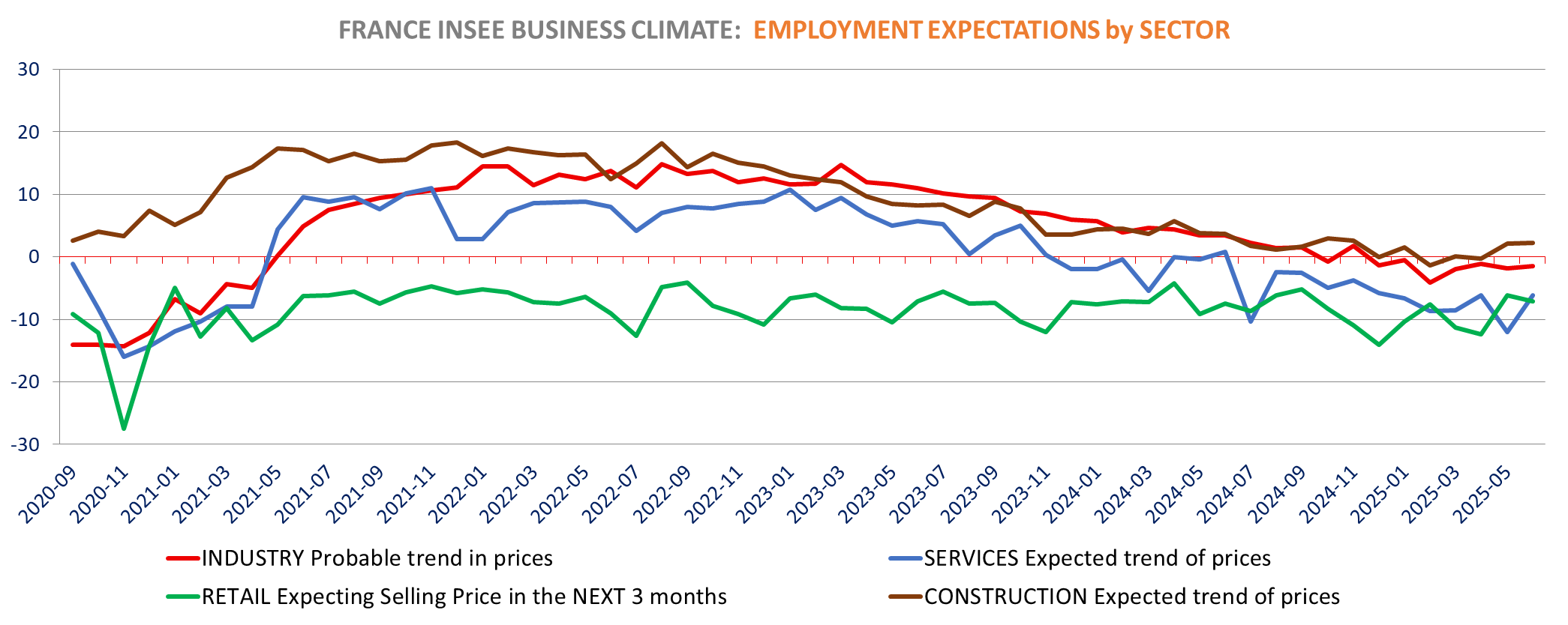 The INSEE Price expectations are lower and negative across sectors but manufacturing where the balance is at +5.8 unchanged from the revised May but higher than the preliminary data of 5.6.