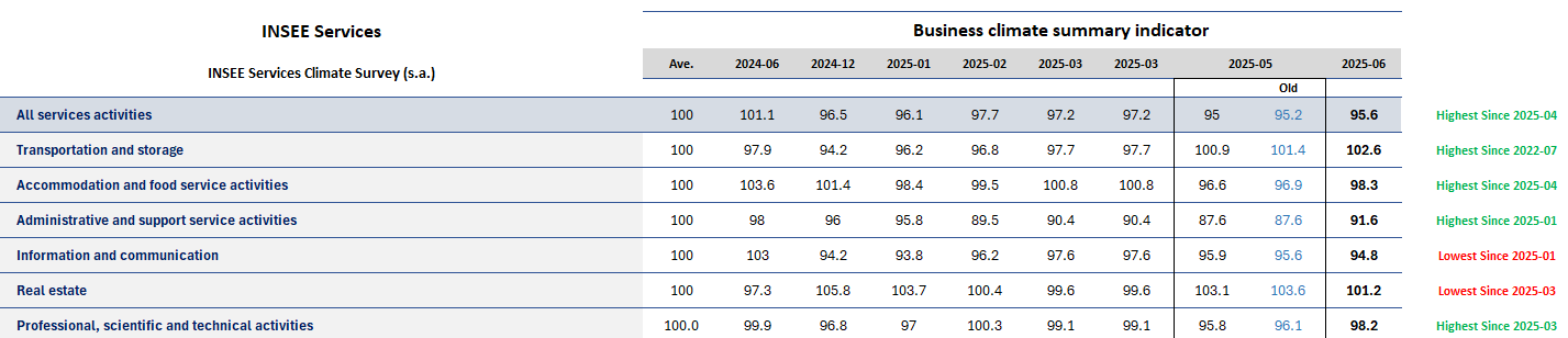 Manufacturing was the main drag at 95.9 down from 97.1 (revised up from 96.9), reported at 96 down from 97. Construction is back to the average of 100 down from 100.5 in May.