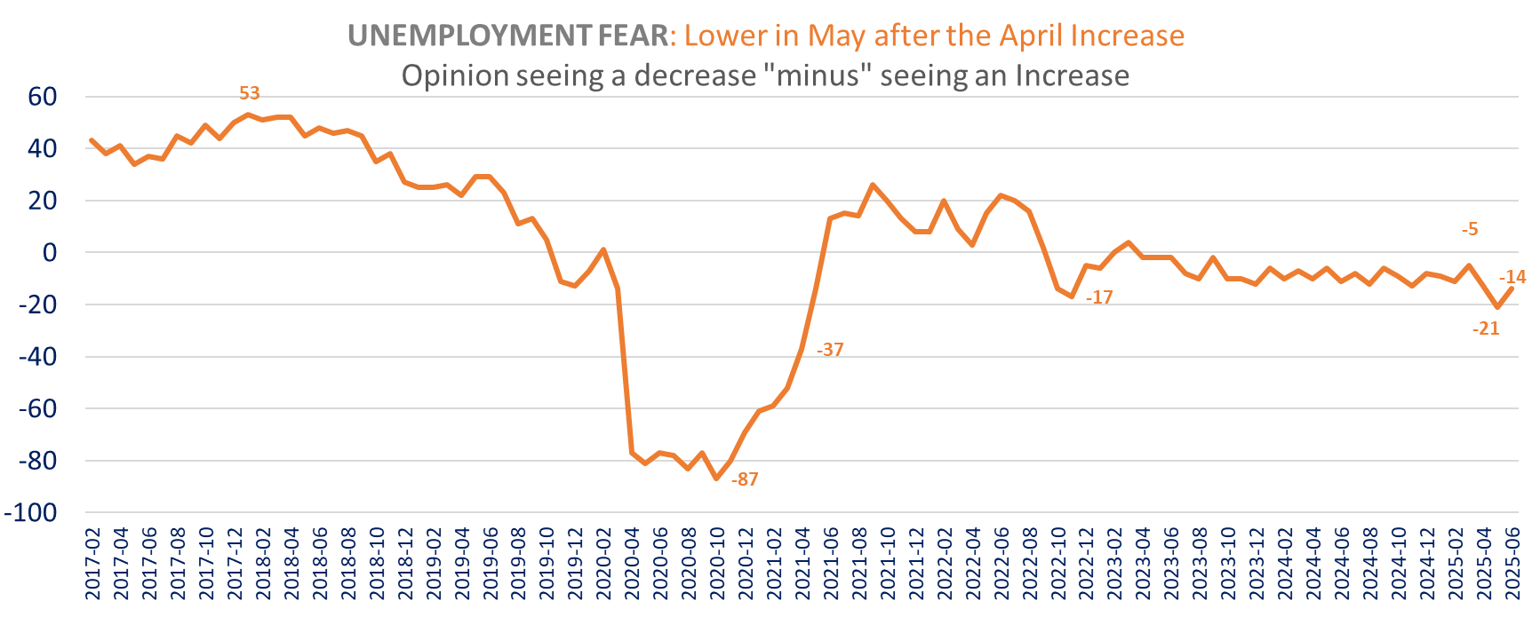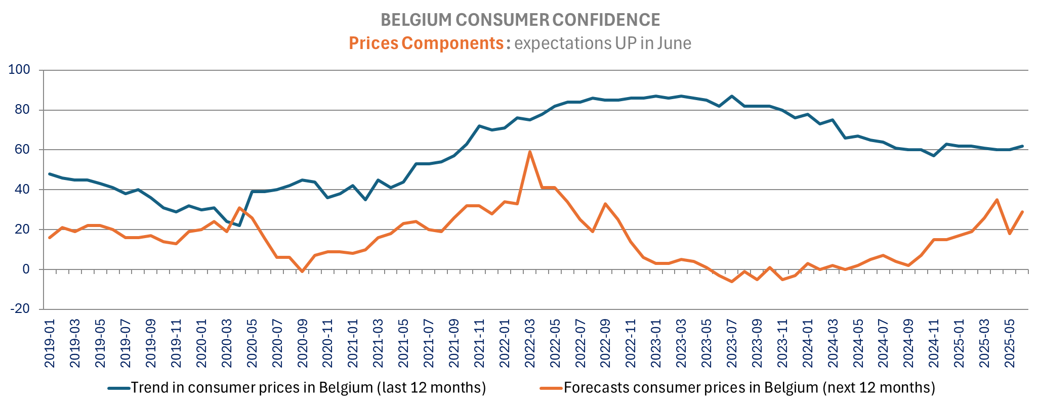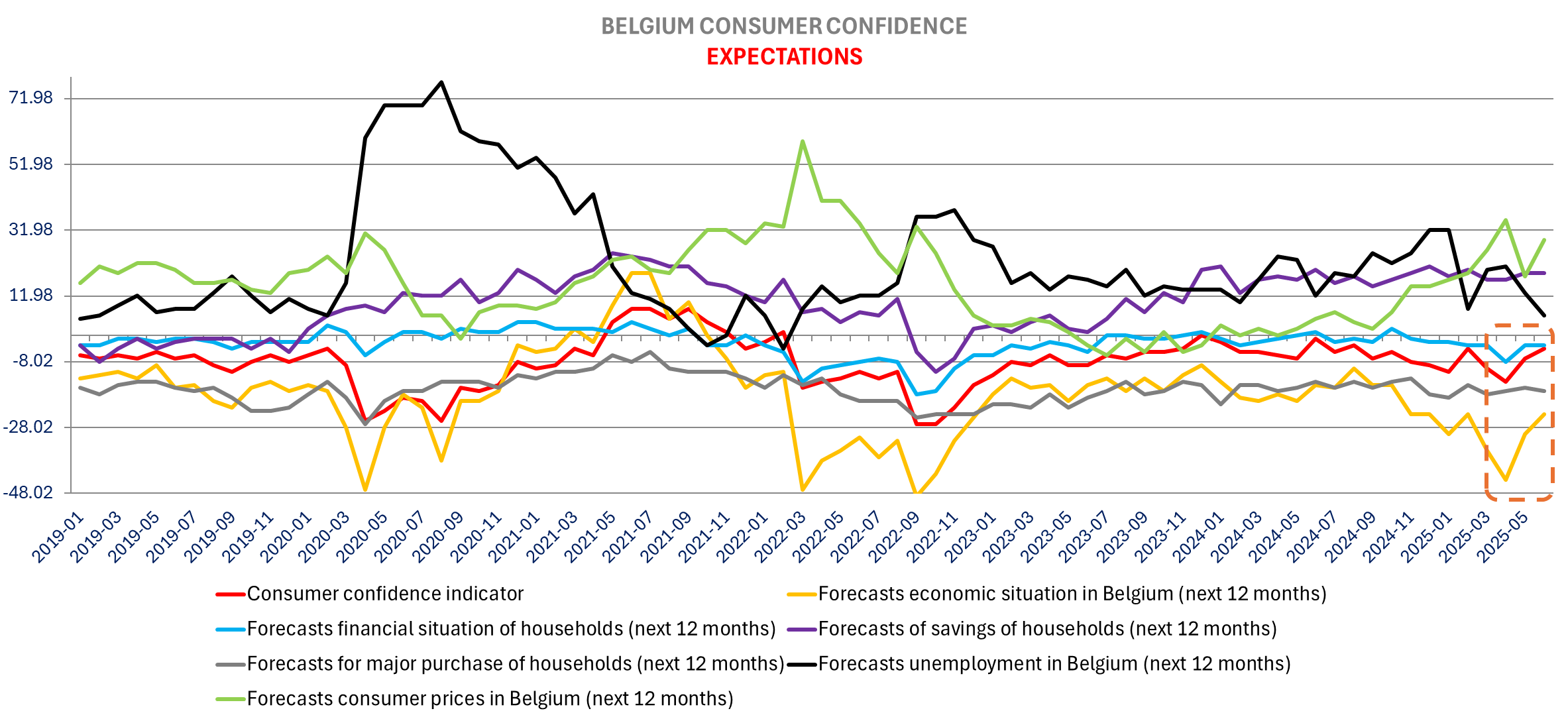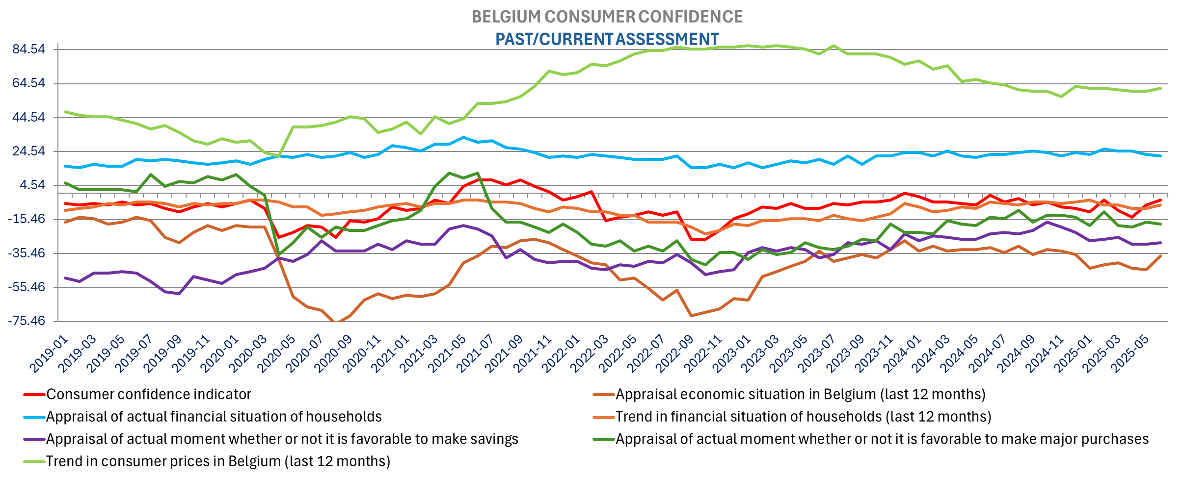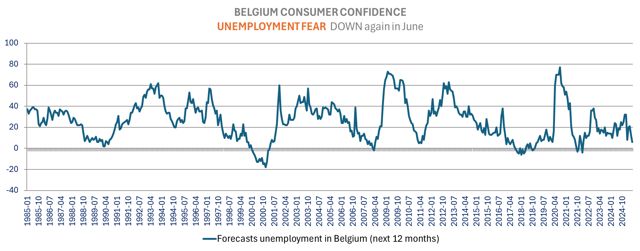 Belgium consumer confidence also improved in June, for the second consecutive month, up to -4 from -7, matching February’s level which was the highest since last August. Unemployment fear is down in Hune to +6 from +13 the lowest since February 2022 (Ukraine invasion). Besides unemployment fear the biggest improvement is for the economic outlook to -24 from -30 and the past economic assessment (-37 vs -45). Households are slightly less positive on their current personal situation *22 vs 23) but less negative on expectations (-7 vs -9, best since January). Purchasing intentions are slightly lower and households are slightly less unfavorable for saving now. Price expectations are back up (+29 in June vs +18 in May) after the fall in May from +35 in April on tariffs concerns (up from 26 in March). NBB Release