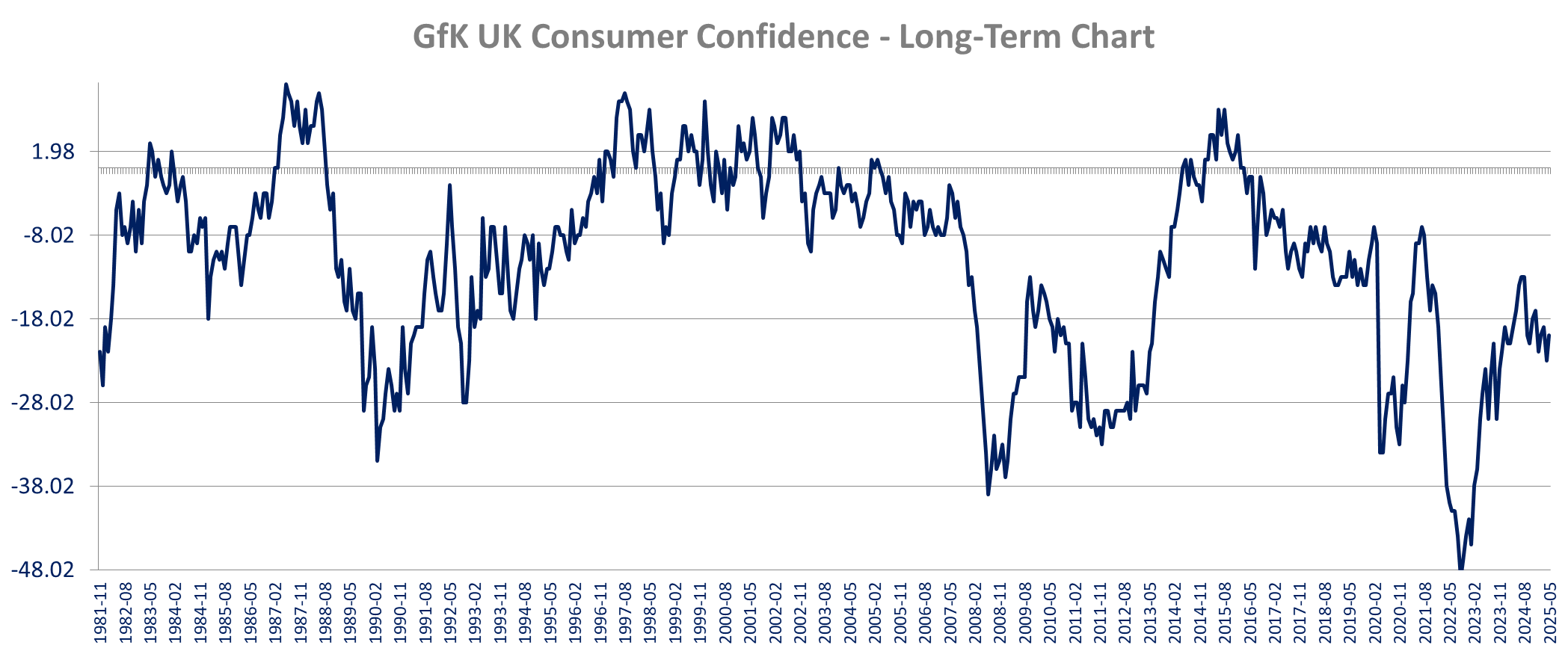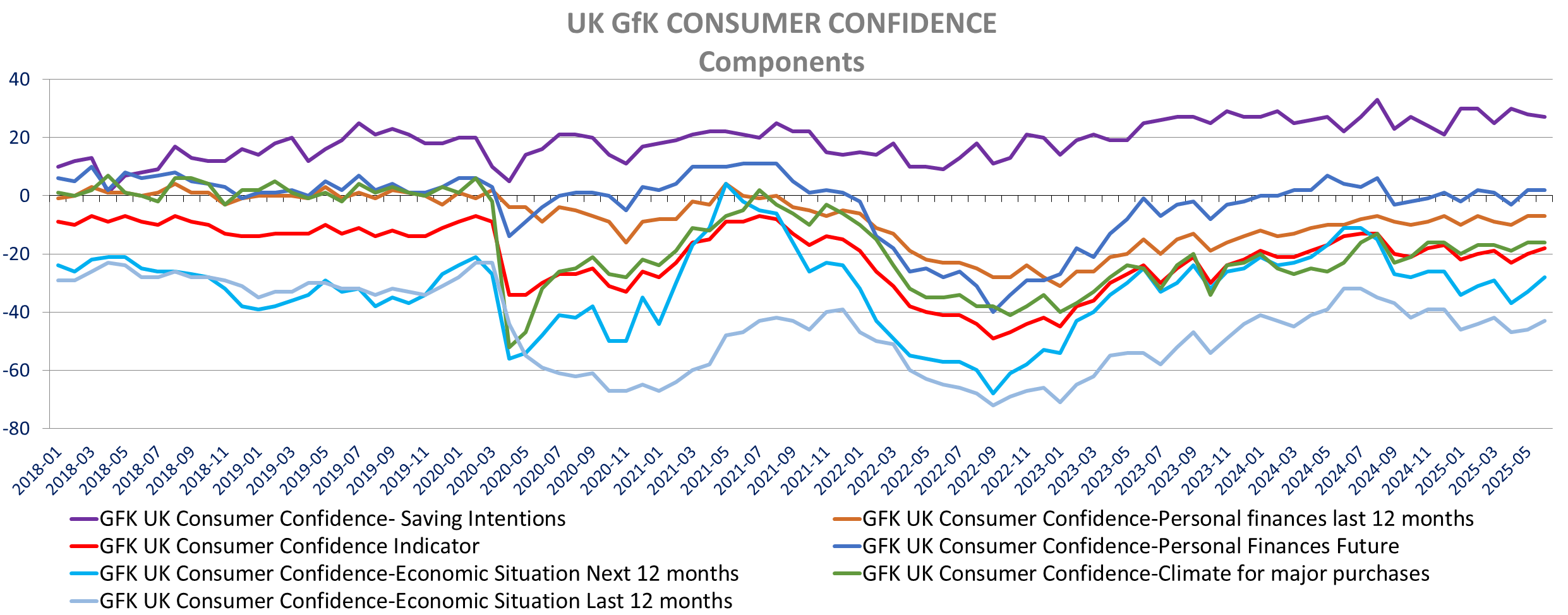 The UK June GfK consumer confidence improved by 2 points in June to -18, the best level since December 2024, but still at a low level. Personal financial situation for the past 12 months (-7) and for the next 12 months (+2) remained unchanged from May. The improvement in the overall confidence index comes from a less negative appraisal of the general economic situation, regarding the last 12 months (-43 vs -46) but also regarding the outlook 12 months out (-28 vs -33, best since December). Consumers remain cautious though: purchasing intention unchanged at -16 and savings’ intention only marginally lower at 27 vs 28 (was 25 in March, pre-tariff). GfK Release