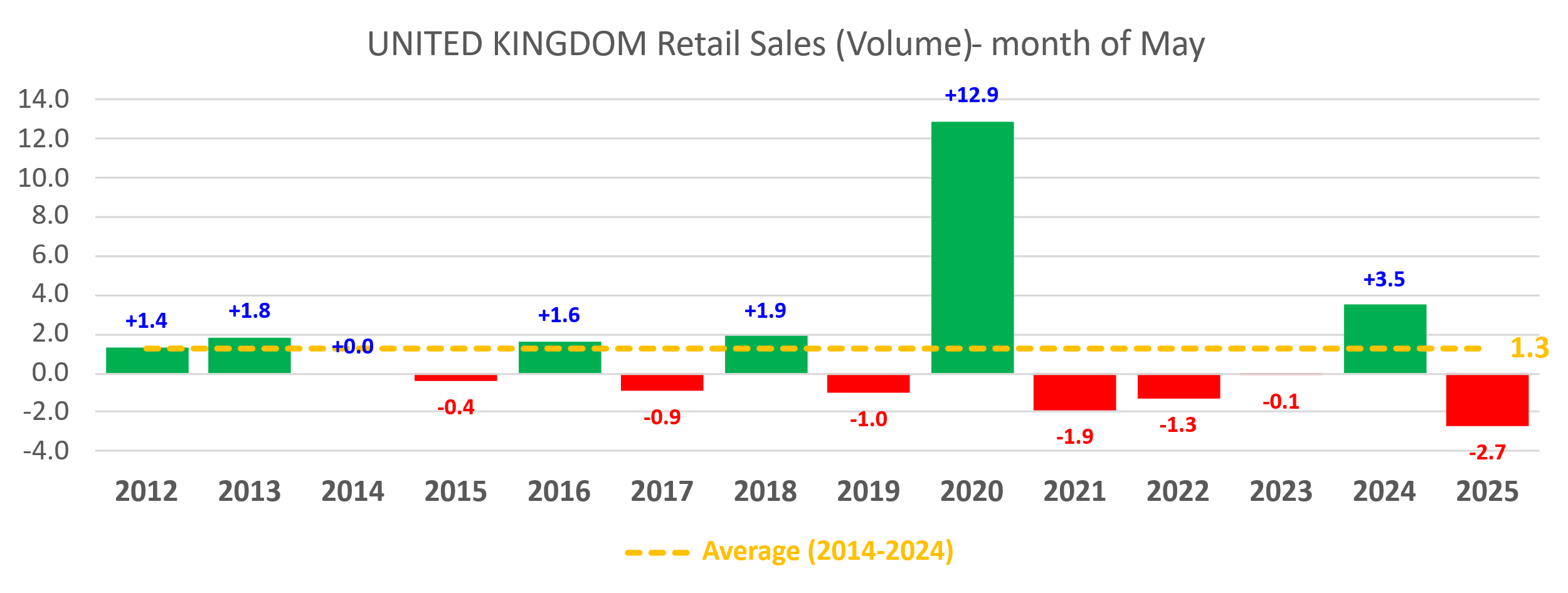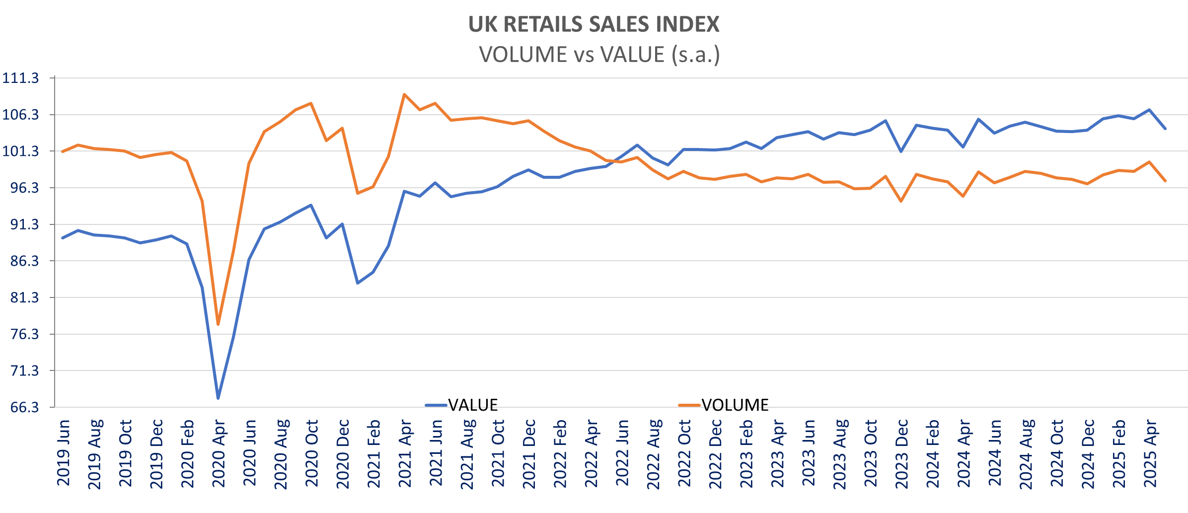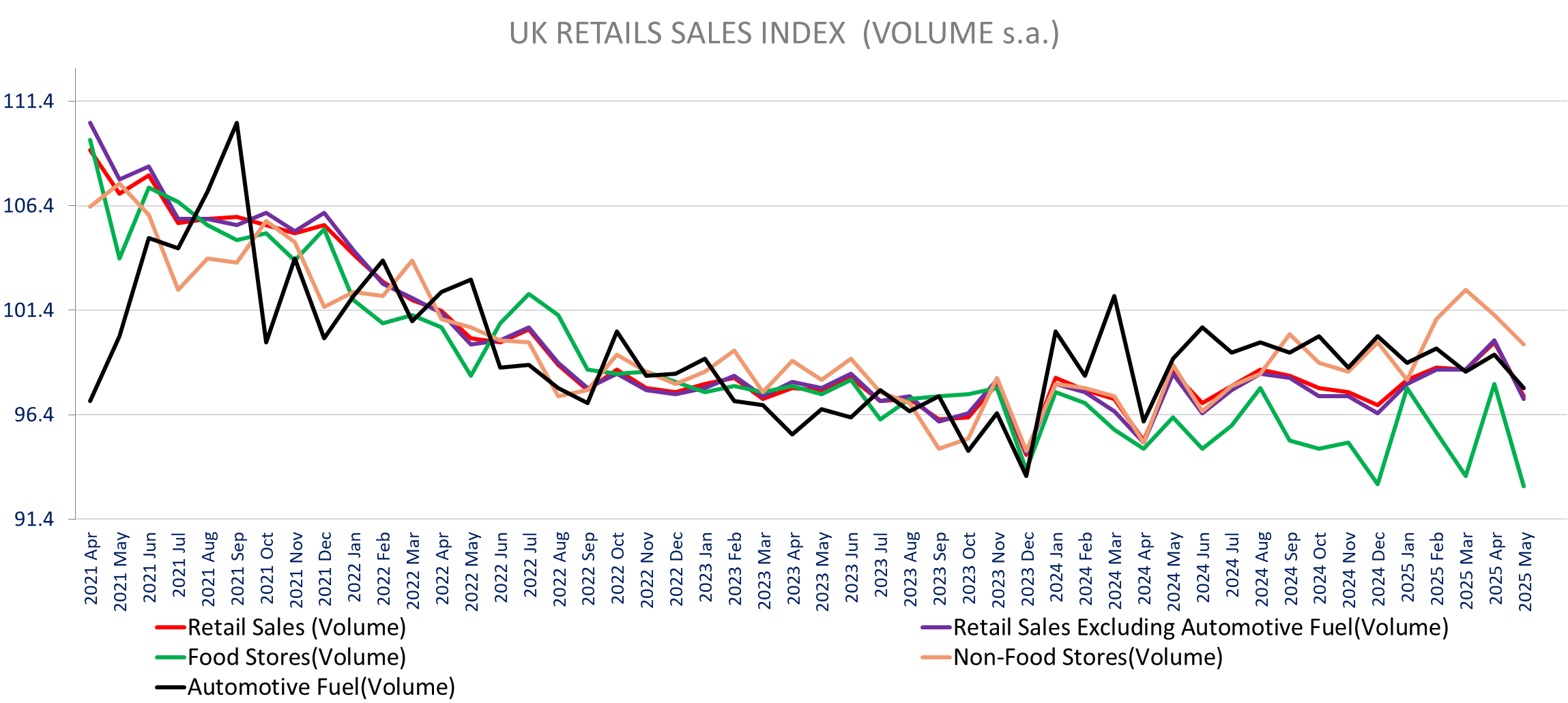 UK June retail sales fell more than anticipated, down -2.7% m/m in volume (-0.5% expected) following the strong April (+1.3% m/m revised form +1.2%). This is the weakest May on record. (+1.3% 10yr average) and the sharpest monthly decline since December 2023. April sales were supported by a warmer than usual weather and the timing of Easter. ONS Release In value, sales are down -2.4% m/m after 1.1% in April. Fuel store sales are down -1.6%m/m in volume and -4.4% in Value.