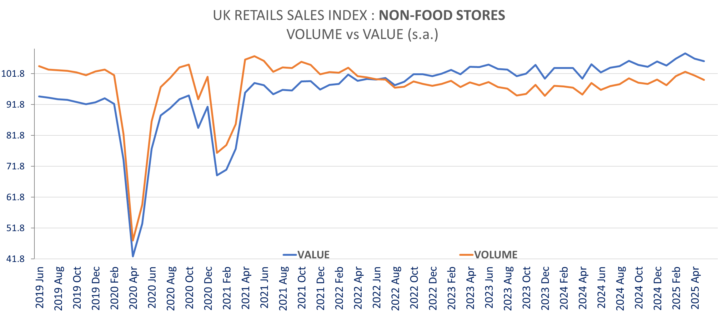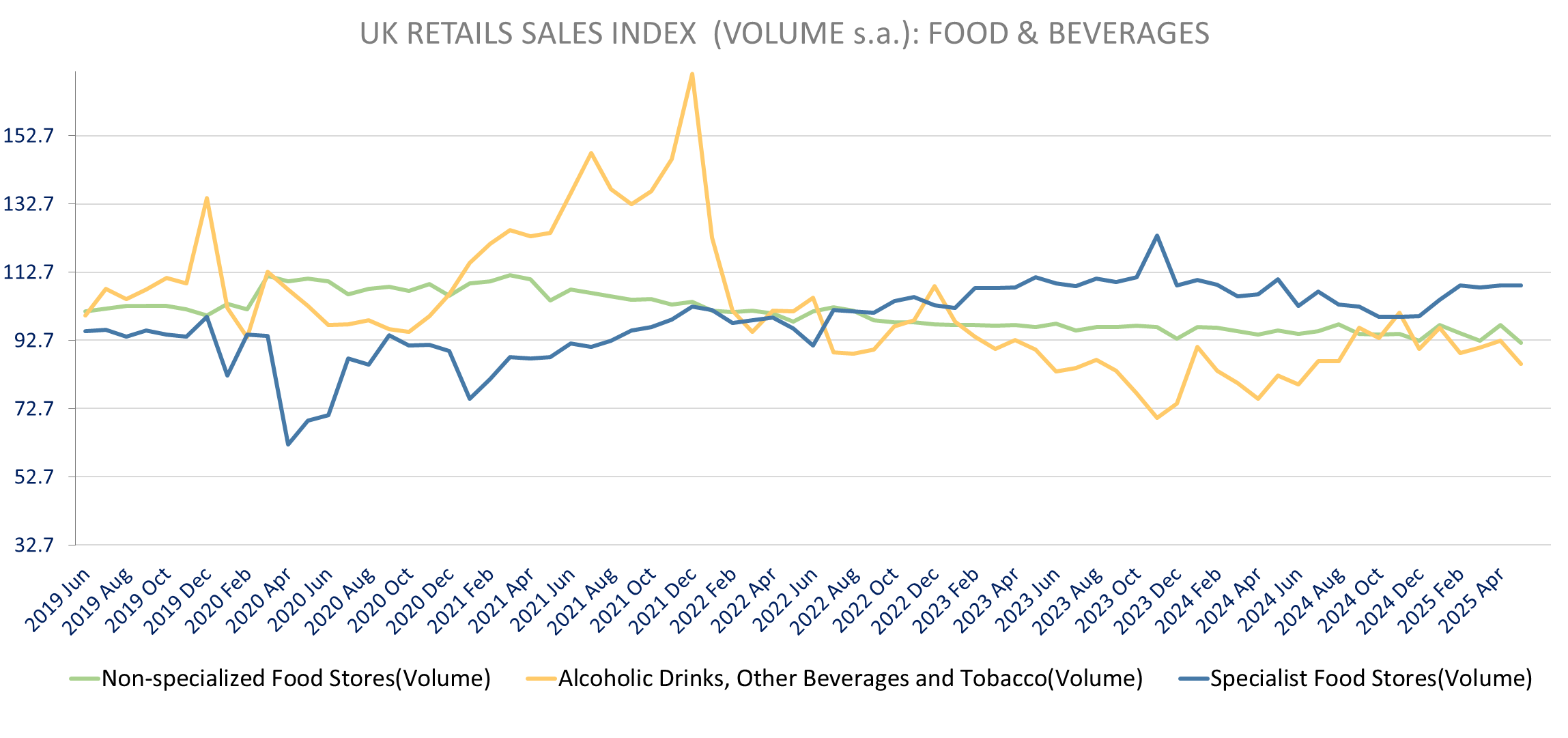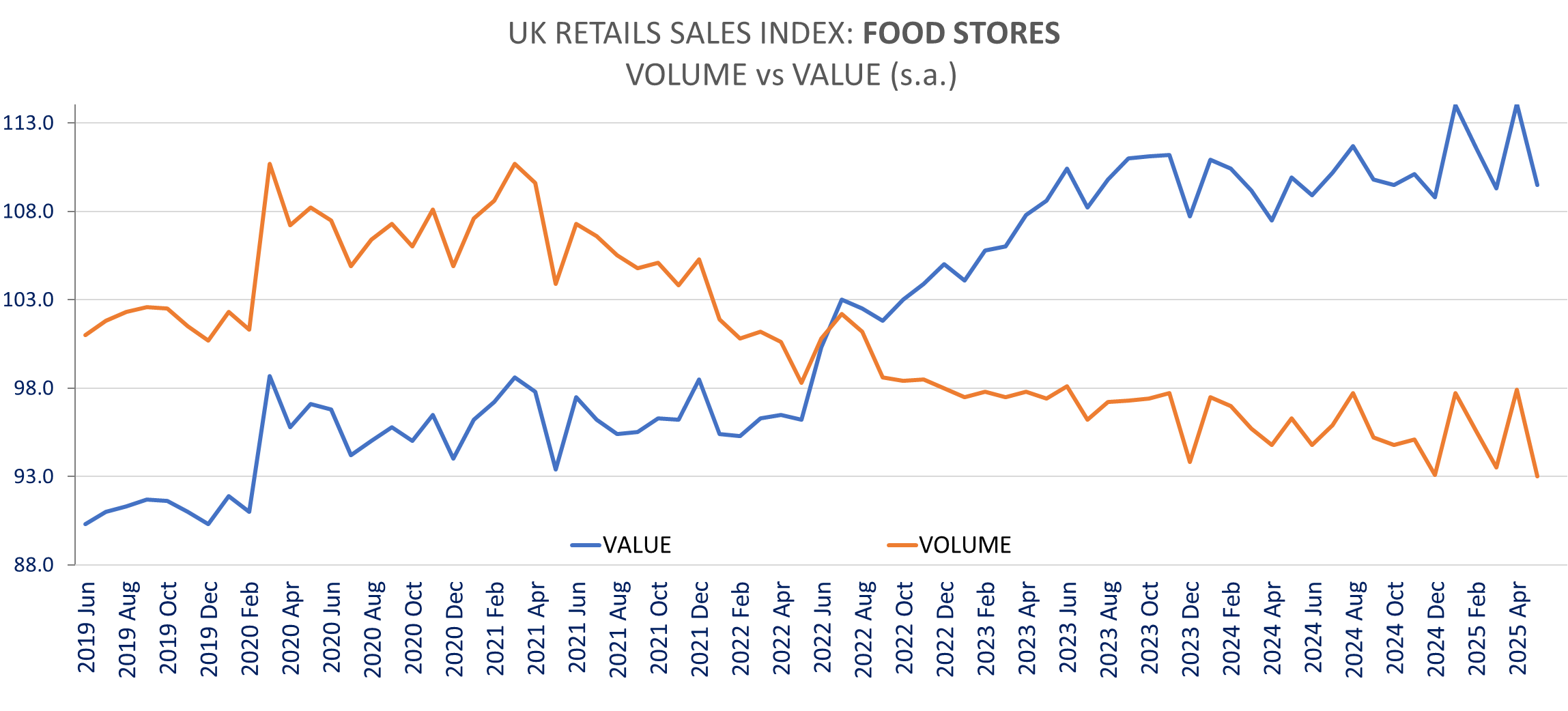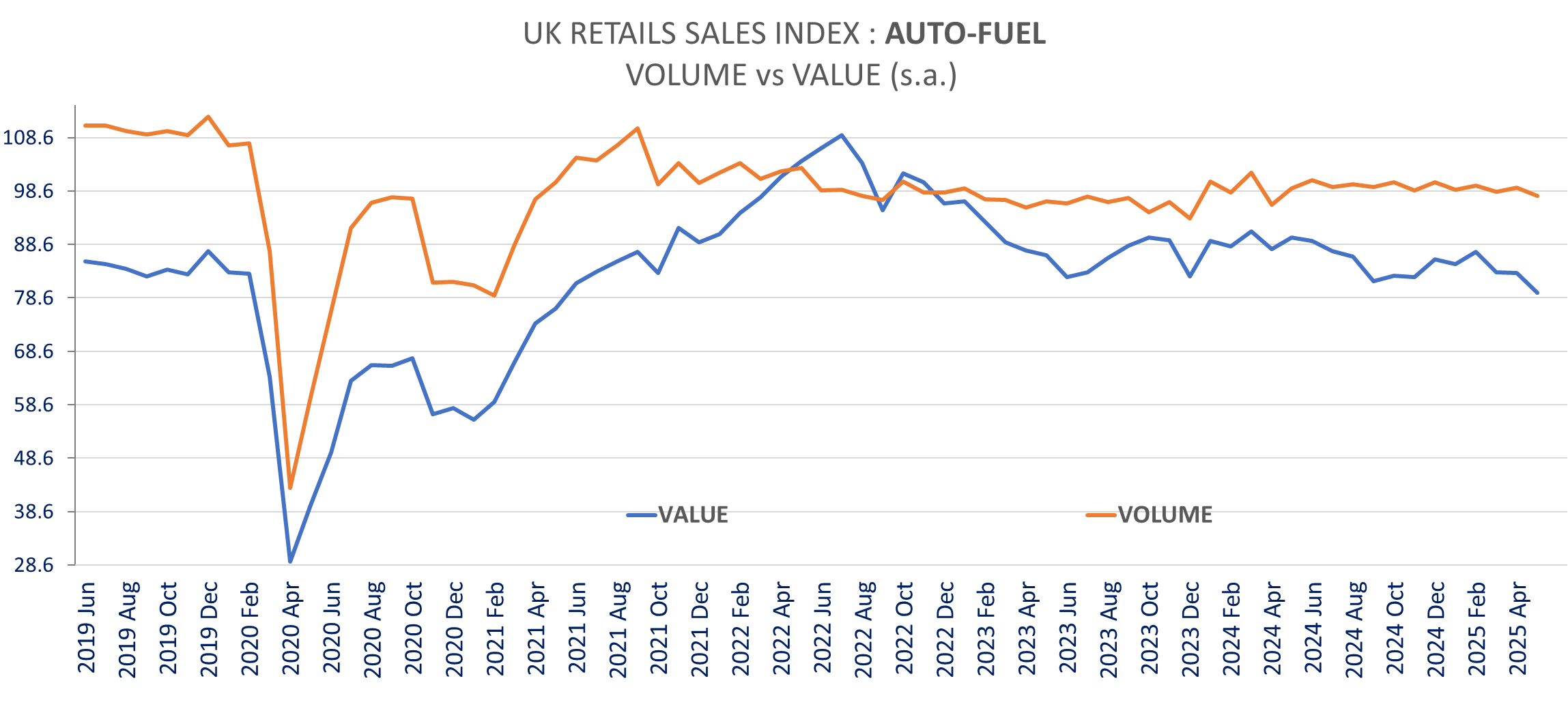 UK June retail sales fell more than anticipated, down -2.7% m/m in volume (-0.5% expected) following the strong April (+1.3% m/m revised form +1.2%). This is the weakest May on record. (+1.3% 10yr average) and the sharpest monthly decline since December 2023. April sales were supported by a warmer than usual weather and the timing of Easter. ONS Release In value, sales are down -2.4% m/m after 1.1% in April. Fuel store sales are down -1.6%m/m in volume and -4.4% in Value.