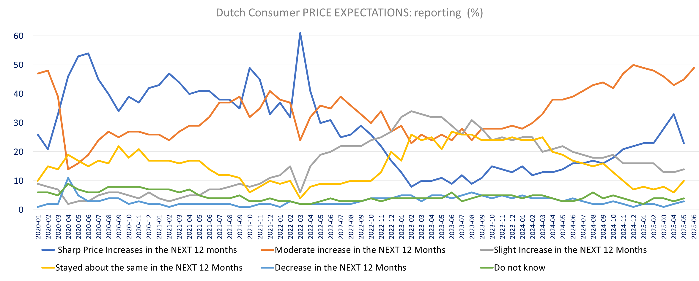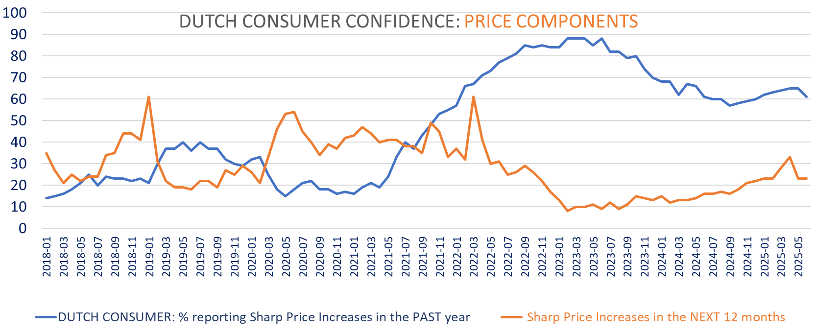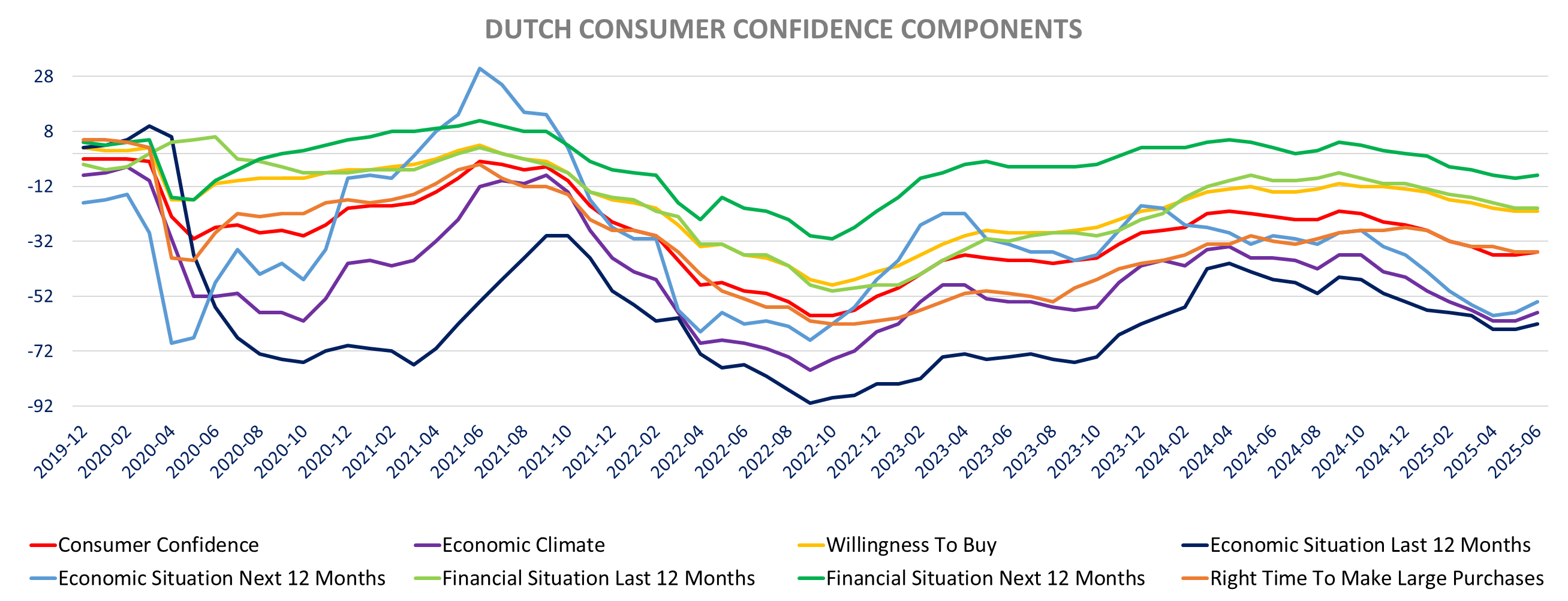 Dutch consumer confidence improved slightly in June to -36 from -37 (still below March Level of -34), remaining at low level by historical standard (-3.4 average). Unemployment fear lessen to -14 balance the dip in April (-21, was the highest fear since April 2021). The Unemployment balance is the difference between % seeing a decrease in unemployment and the % seeing a increase (the lower the higher the unemployment fear). The improvement in confidence comes from a less negative view on the economy, both the past economy (-62 vs. -62) and the 12 months outlook (-54 vs -58, Best since February, up for the 3rd month in a row. The current/past financial situation unchanged (-20) but the future financial situation improved slightly (-8 vs -9). On the price side the % of households expecting price sharply higher is unchanged at 23%, and the percentage expecting a moderate increase in the next 12 months is up to 49% from 45%. Only 1% see lower prices. 61% report a sharp increase in prices in the last 12 months down from 64%. Willingness to Buy, large purchase intention and savings’ intentions balance are unchanged month-over-month.