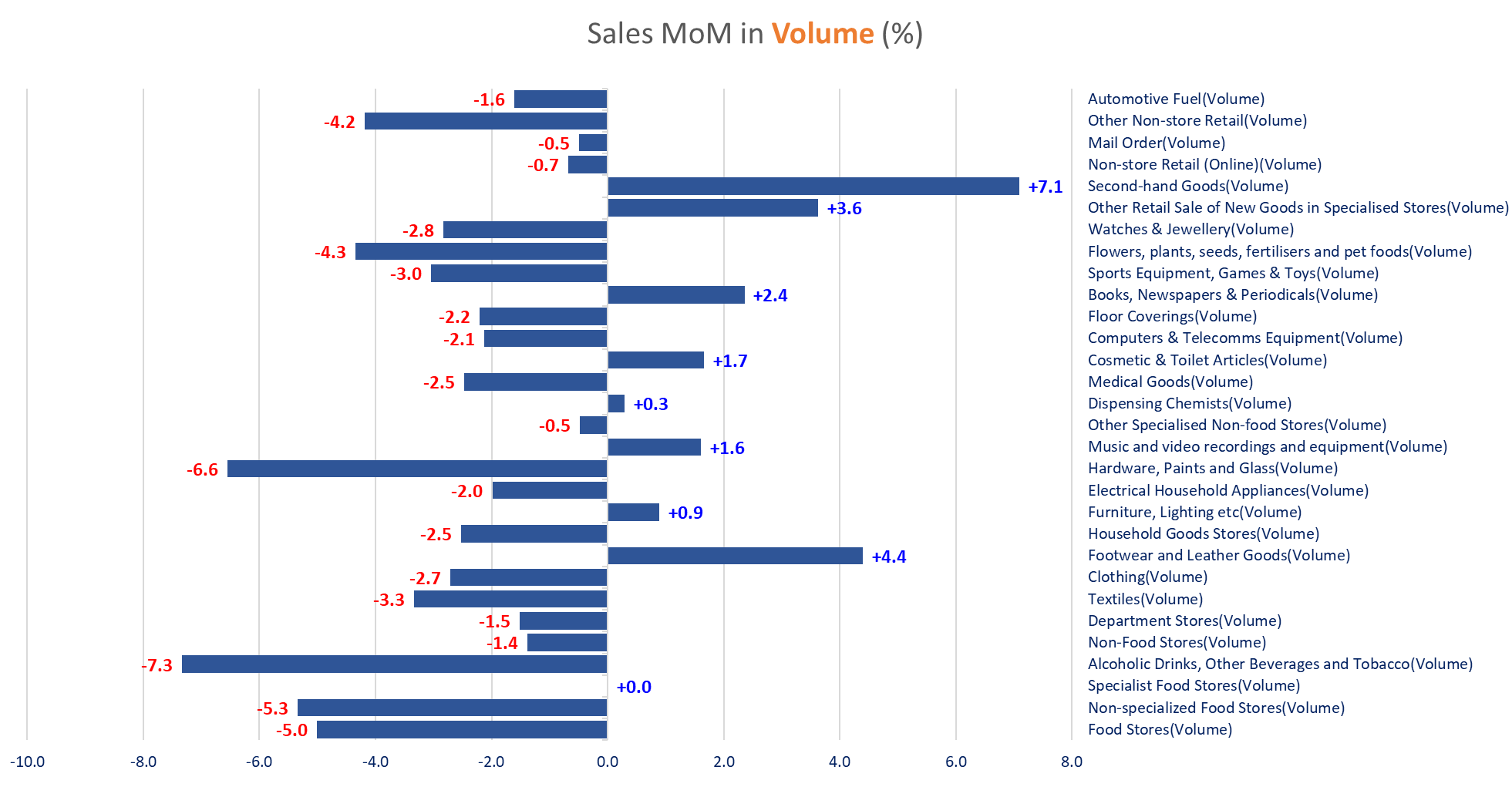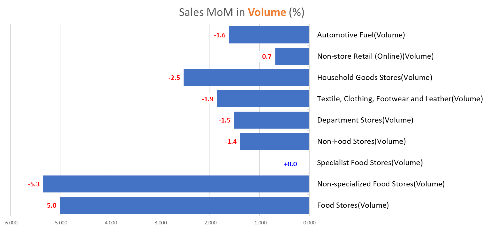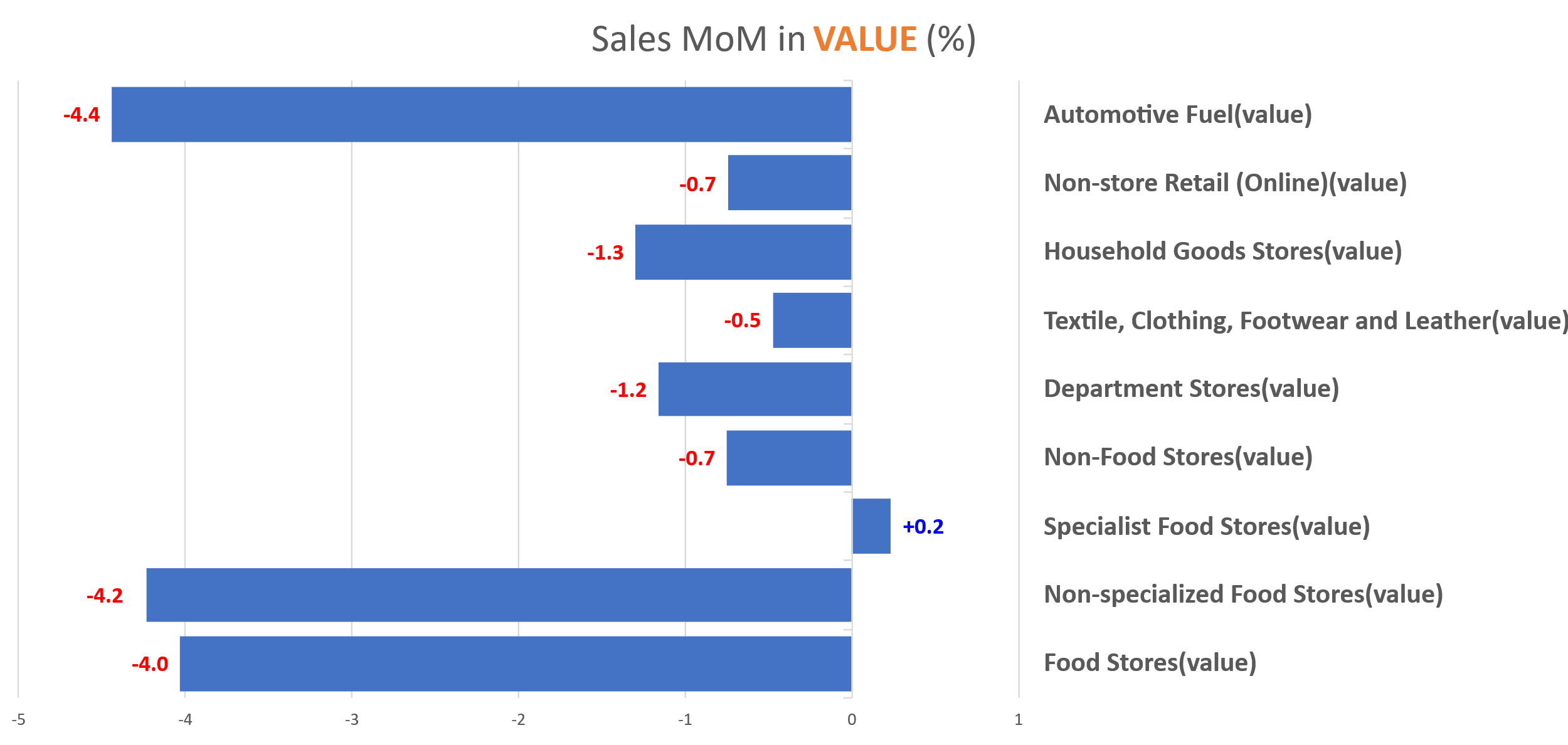 Looking at more details, footwear & leather sales were up 4.4% m/m while textiles fell -3.3% and clothing -2.7% m/m. We also saw sharp decline in flower/plans (-4.3% m/m) and electrical household appliances (-6.6%), Sports equipment/Games/toys (-3%). Othe the other side, second-hand stores’ sales increased by +7.1%, books/newspaper +2.4% and cosmetic +1.6% m/m (all in volume)