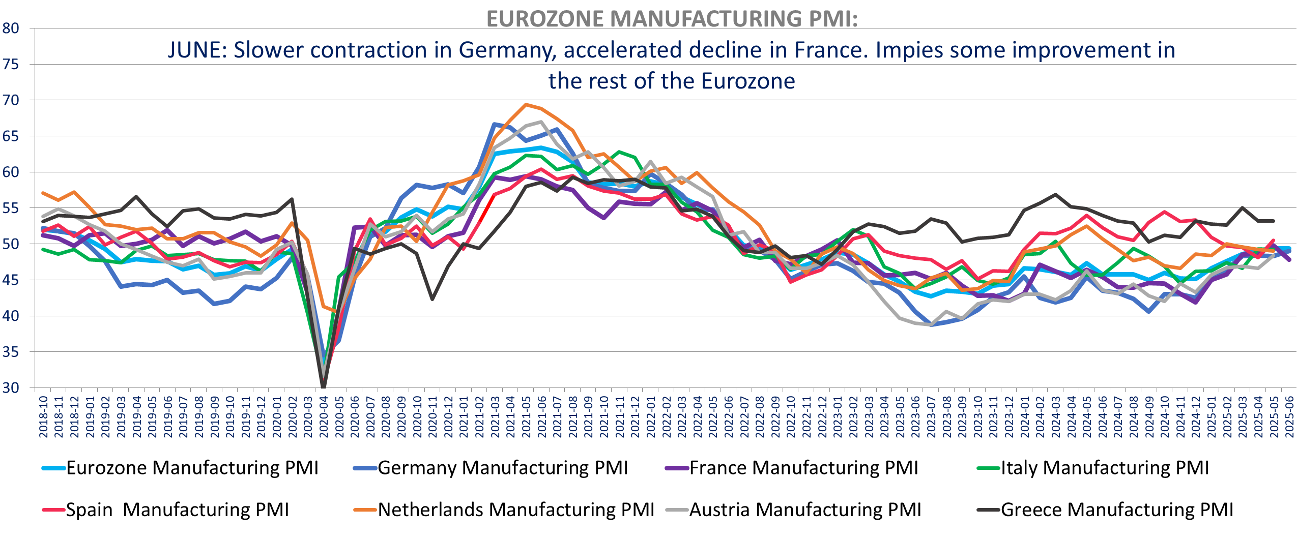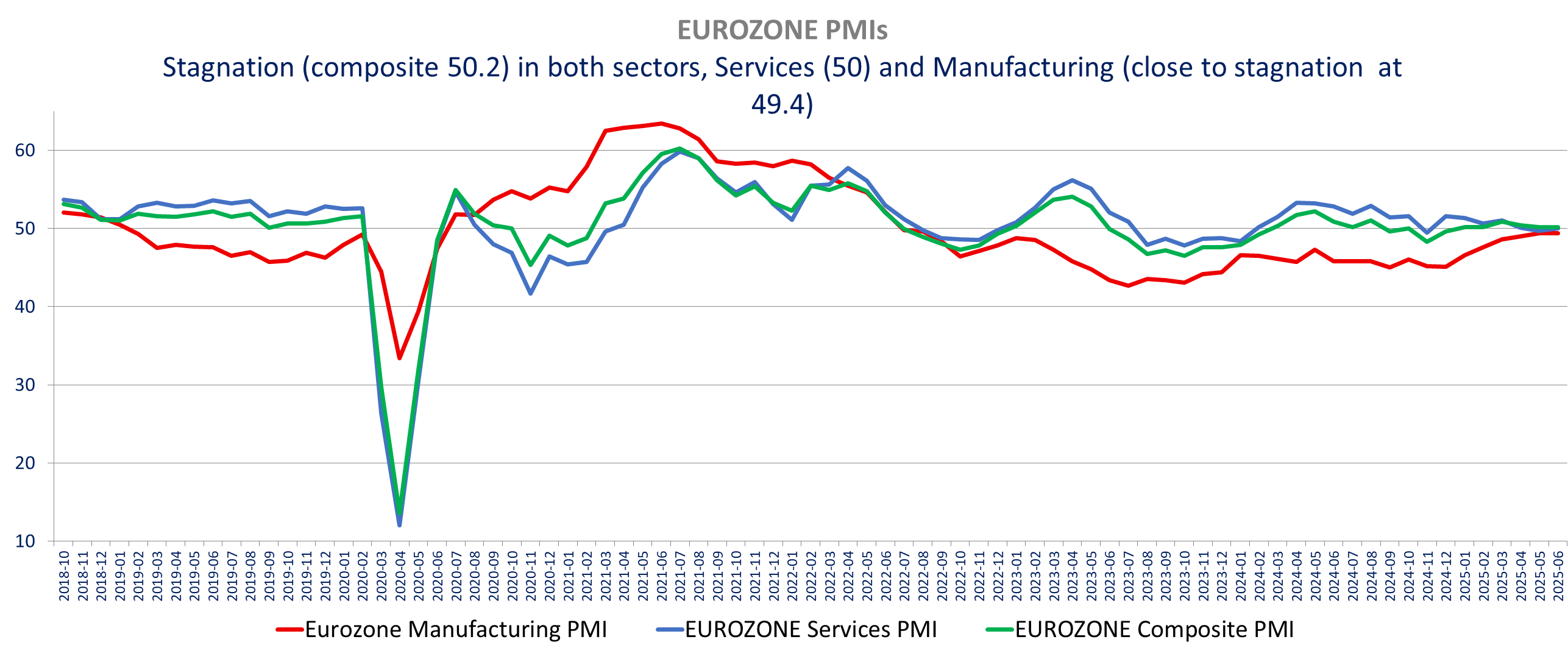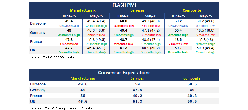 The Eurozone composite PMI is slightly below expectation of 50.5, unchanged in June at 50.2, consistent with stagnation. The Eurozone Manufacturing PMI is also unchanged from May to 49.4, slightly below expectations of 49.8, and the services PMI improved slightly to 50 from 49.7 in May in line with expectations.