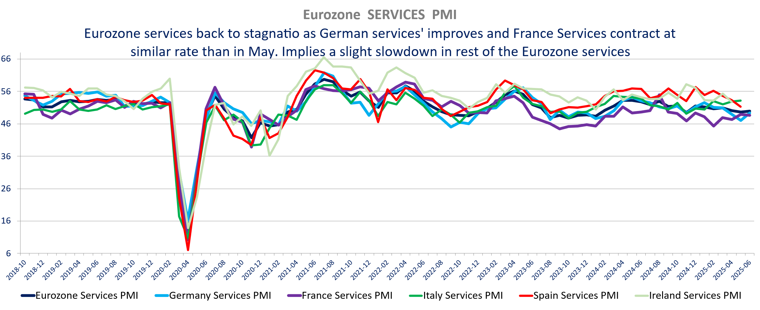 On the price front, we see a resurgence of selling price inflation in services: Services’ prices charged increased at the fastest rate in 3 months. France Services providers renewed increasing price charged in June joining German Services providers (although slightly less inflation than in May) and the rest of Eurozone. Manufacturing output prices declined slightly for the second month, But overall, the survey points to higher inflation.