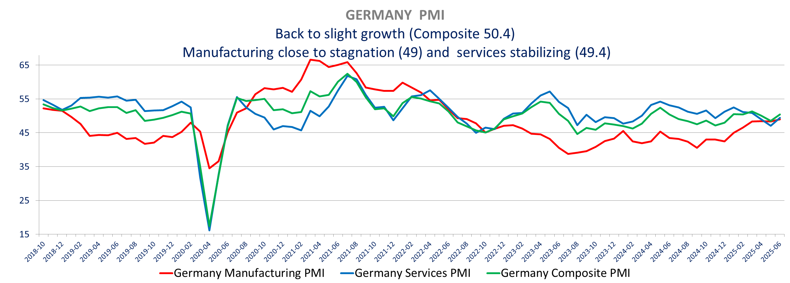 Germany returned to slight growth with composite at 50.4 up from 48.5 ahead of expectations of 49. The better-than-expected composite came from better Services PMI at 49.4 vs 47.1 in May ahead of expectations of 47.5. Manufacturing improved as well but in line with expectations Manufacturing at 49 vs 48.3 in May expectations, highest in 34 months.