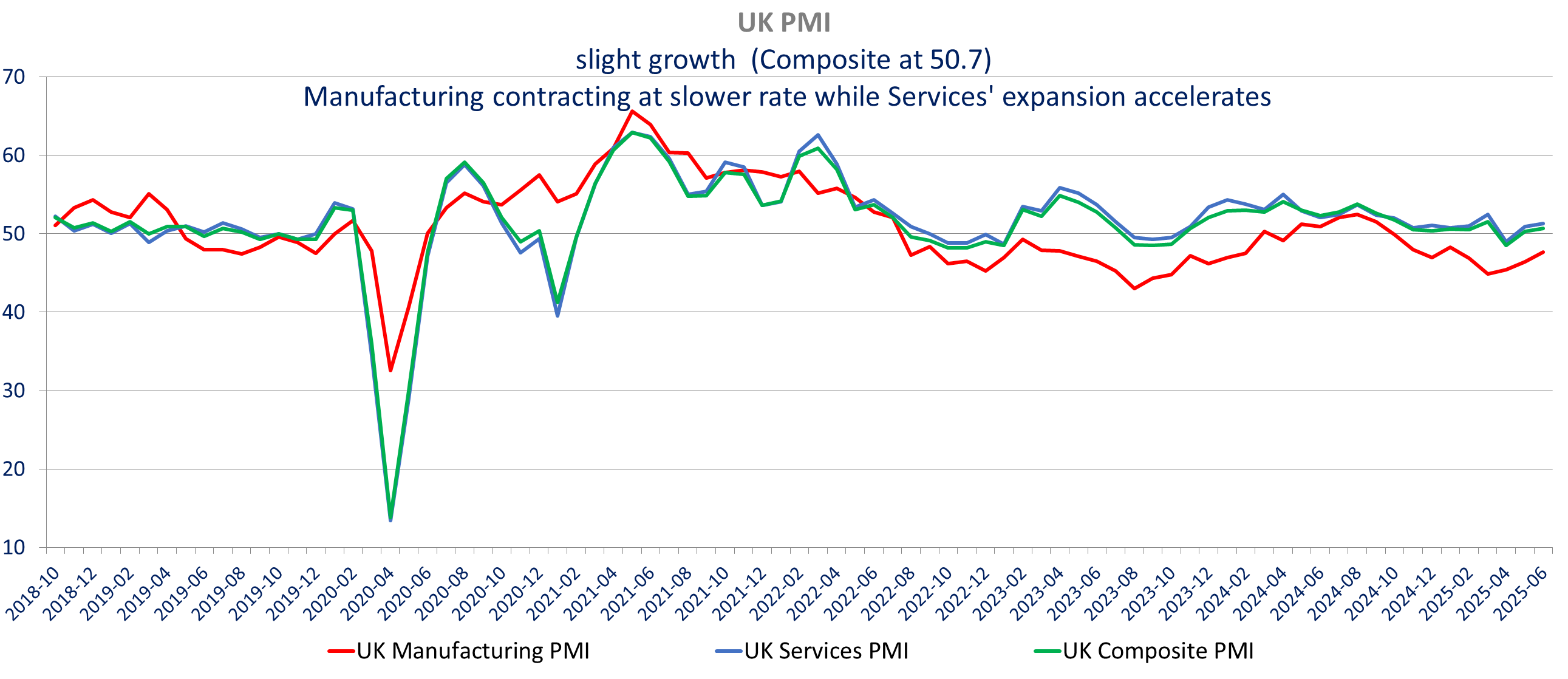 The UK economy accelerated slightly more than expected in June with the composite PMI at 50.7 up from 50.3 in May, better than 50.5 anticipated by economists. The Services PMI is in line with expectations at 51.3% showing an acceleration from 50.9 in May. The manufacturing PMI beat expectations at 47.7 (5-month high), up from 46.4 while forecasts were 46.6.