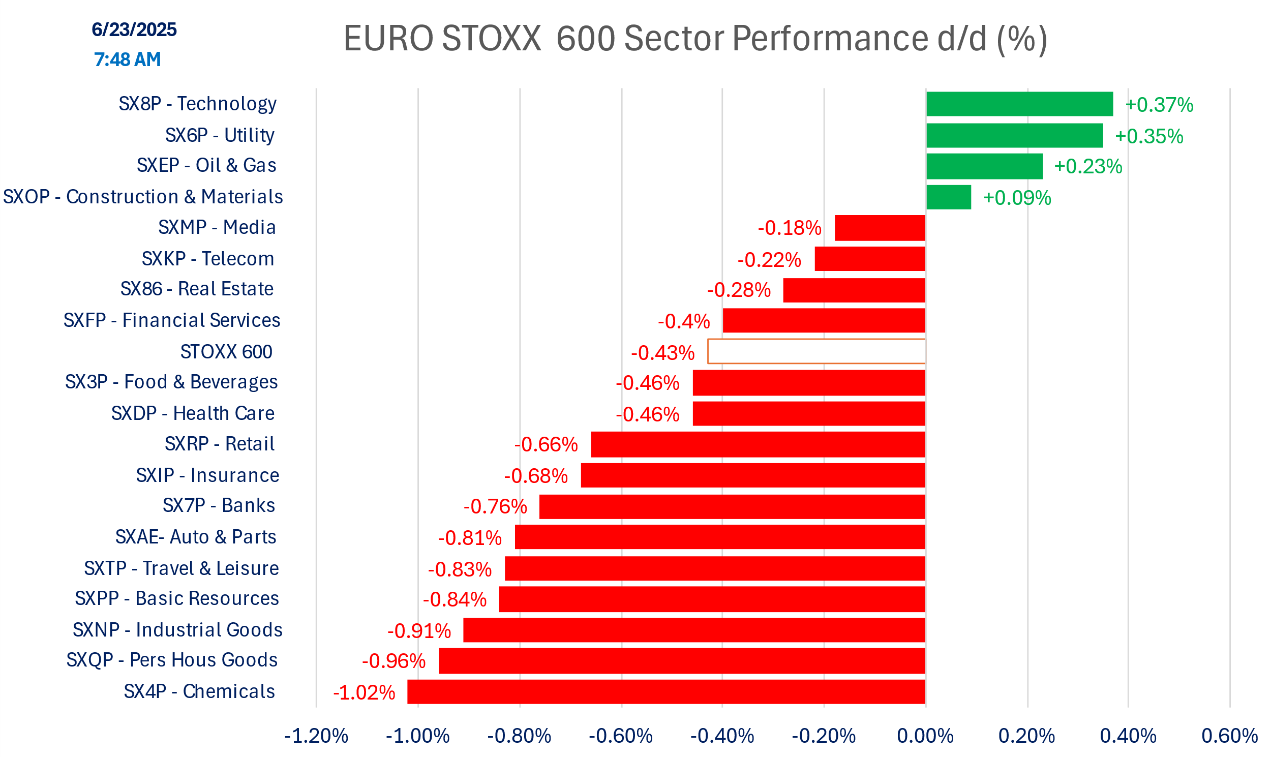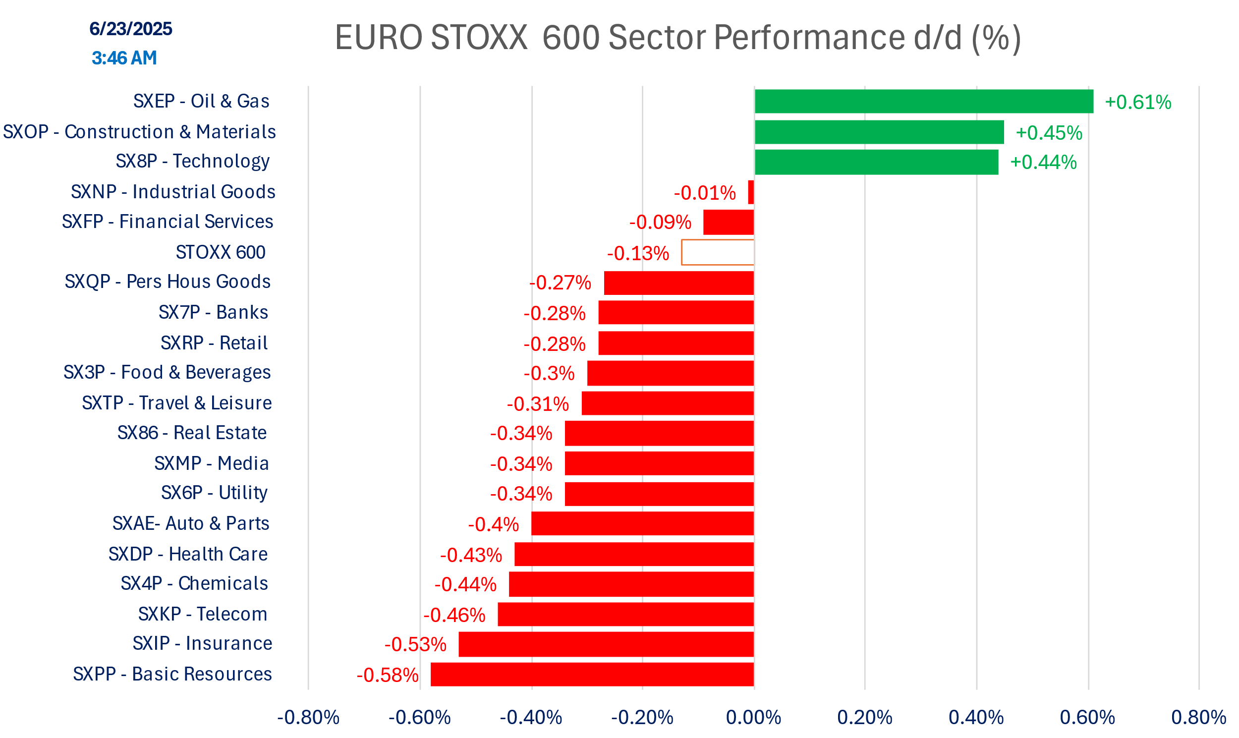 Far more muted market reaction to the US bombing of the Iranian nuclear facilities. As we started to see last week, the $ continued to benefit, apparently reclaiming some safe haven status, but it seems mainly due to one sided negative sentiment (Last week’s ZEW investor $/€ sentiment was the most negative on the $ since December 2006). The DXY is up 0.6% to 99.36, oil is also only up 0.6% to $77.6 (Brent) but is still up more than 20% in the last month. Asian stock markets fell only slightly, and European stocks are only down - 0.4% (only oil & gas, utilities and technology are up). Bond yields are up with slight flatter curves, not as one would have expected. Gold is slightly up, but Bitcoin declined (momentarily below 100k post report of the facilities’ bombing).