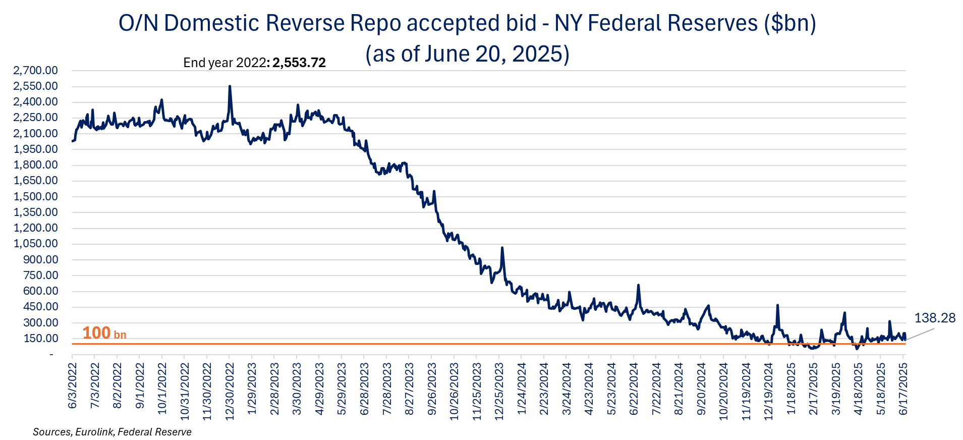 Better tax receipts in June, leading to a larger increase in the TGA than expected last week. The Treasury General Account increased by $106.83bn Week over week to $383.85bn while the domestic reverse Repo was stable (+$425m w/w) at $205.05. (The Domestic RR fell to $138.38bn as of Friday and will re-increase at the end of the month / quarter).