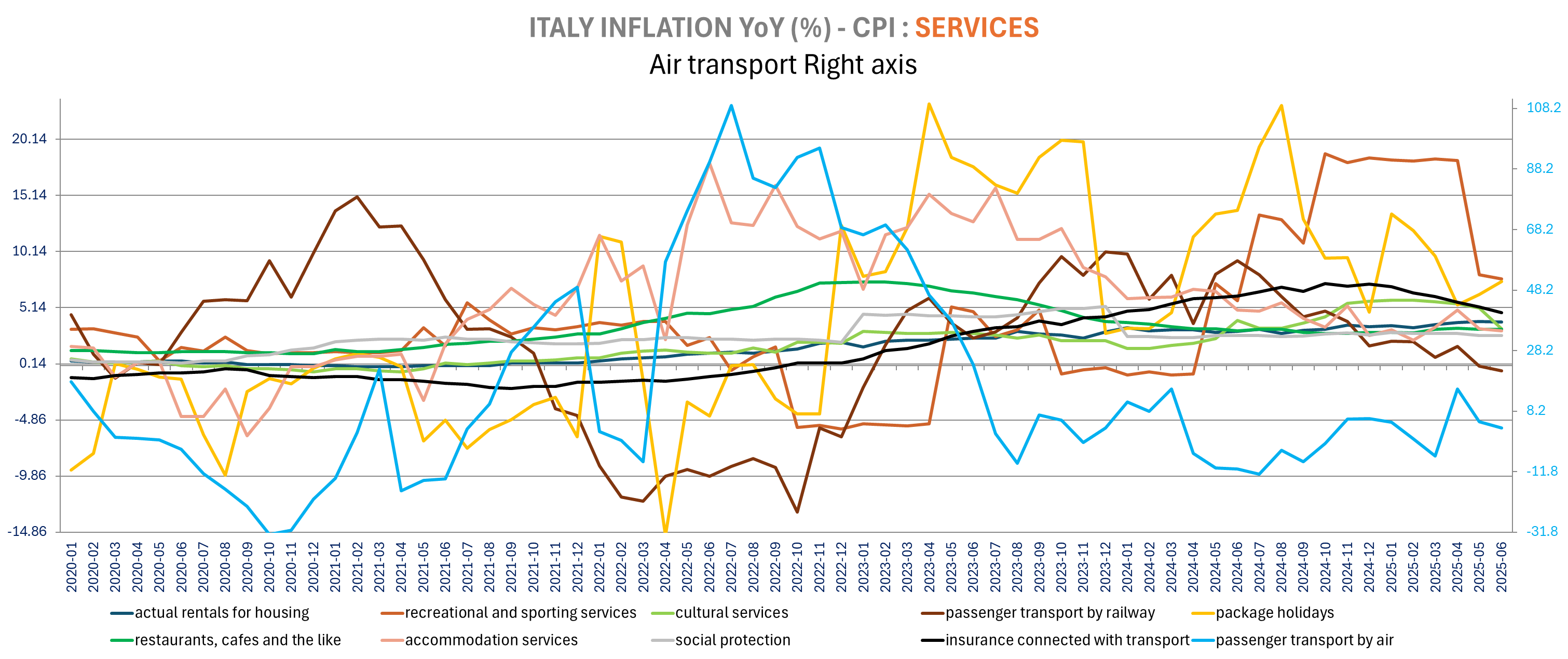 In services inflation increased for package holidays (7.5% vs 6.3%) and transport services (2.85% vs 2.6% mainly road transport). Restaurants, social protection, education and rent saw stable inflation. Inflation decreased for accommodation (3.1% vs 3.3%), cultural services (3.3% vs 5.1%) and sporting & recreational services (7.7% vs 8.1%). Auto insurance inflation decreased to 4.7% from 5.2%.