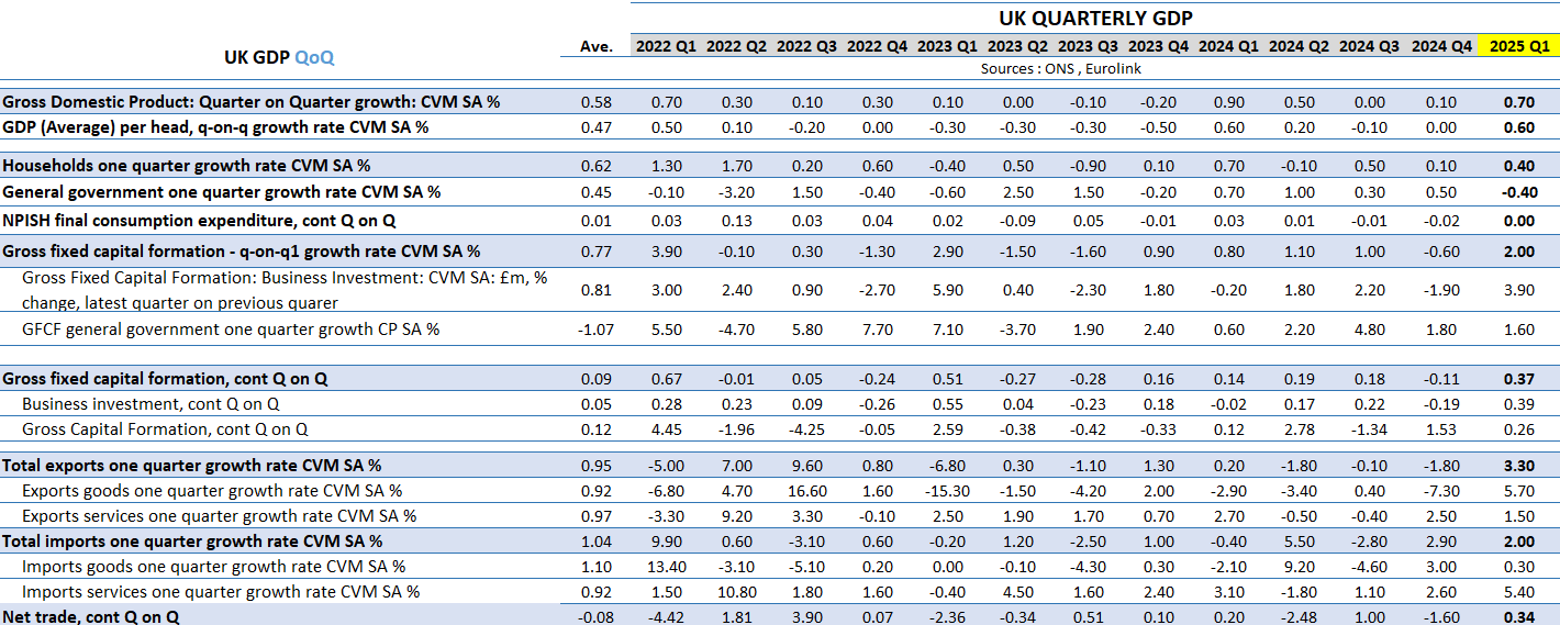The UK Q1 GDP is confirmed at 0.7% q/q on strong GFCF and exports. The Q2 GDP will be lower and we expect the BoE to ease in August.