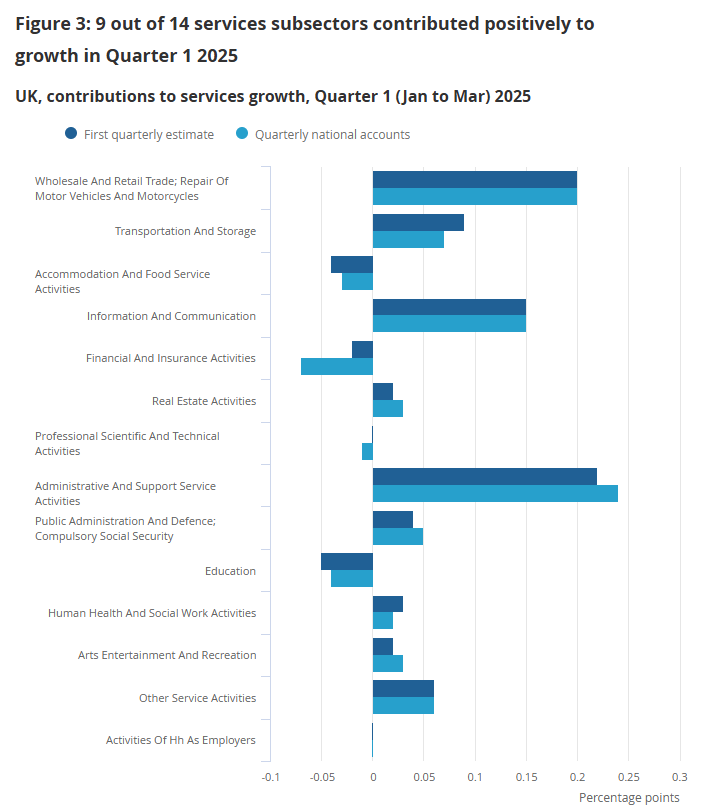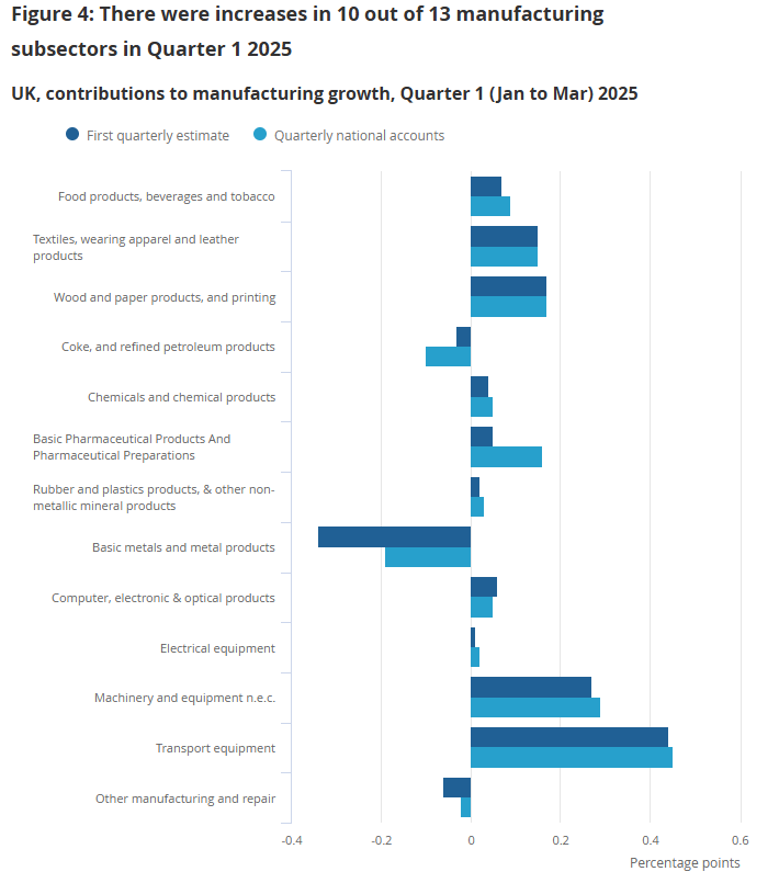 The UK Final estimate of Q1 GDP shows stronger growth, up 0.7% q/q in line with the preliminary estimates Services grew 0.7%q/q with the largest contribution from administrative and support service activities (3.7%) and wholesale and retail trade (1.6%). Construction is up 0.3% and production 1.3% (o/w manufacturing 1.1% q/q and water supply, sewerage, Waste management up 4% q/q, energy up 2.5% m). Within manufacturing transport equipment increased 2.8% and machinery and equipment 4%.