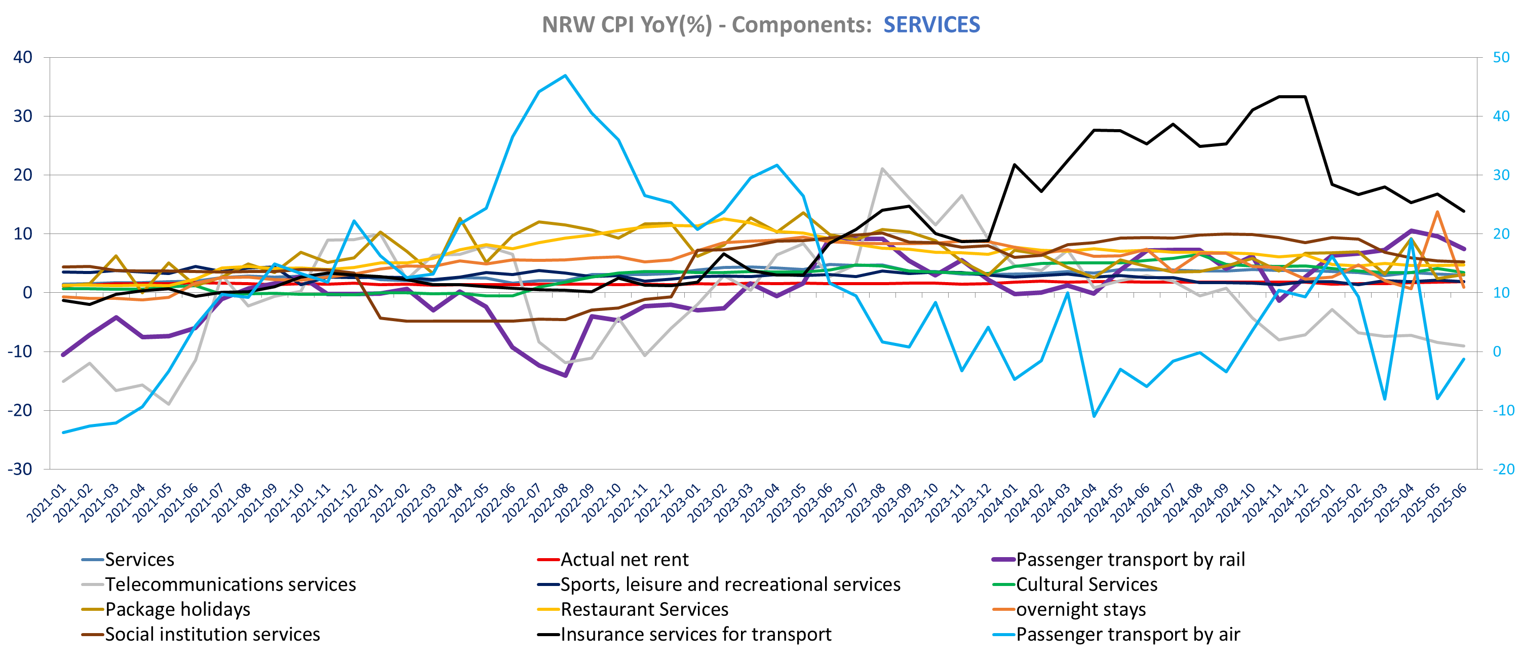 The data for NRW shows a decline in core inflation to 2.35% from, 2.5% (0% m/m) with services inflation down to 3% from 3.2% with lower accommodations inflation (1% vs 13.4% in May, down -9.6% m/m), social services (5.25% vs 5.45%), outpatient services (2.5% vs 2.35% and car insurance (13.9% vs 16.8%). Rail transport inflation also eased to 7.4% from 9.6% along communication services (-9% vs -8.4), cultural services (3.45% vs 4.1%) and sport, leisure & recreational services (1.9% vs 2.1%). It was partially compensated for by higher air transport services inflation (-1.3% vs -8%), package holidays (3.1% vs 2.4%), restaurants (4.7% vs 4.6%), Education (4.8% vs 4.7%) and rent (1.9% bs 1.8%). NRW Release