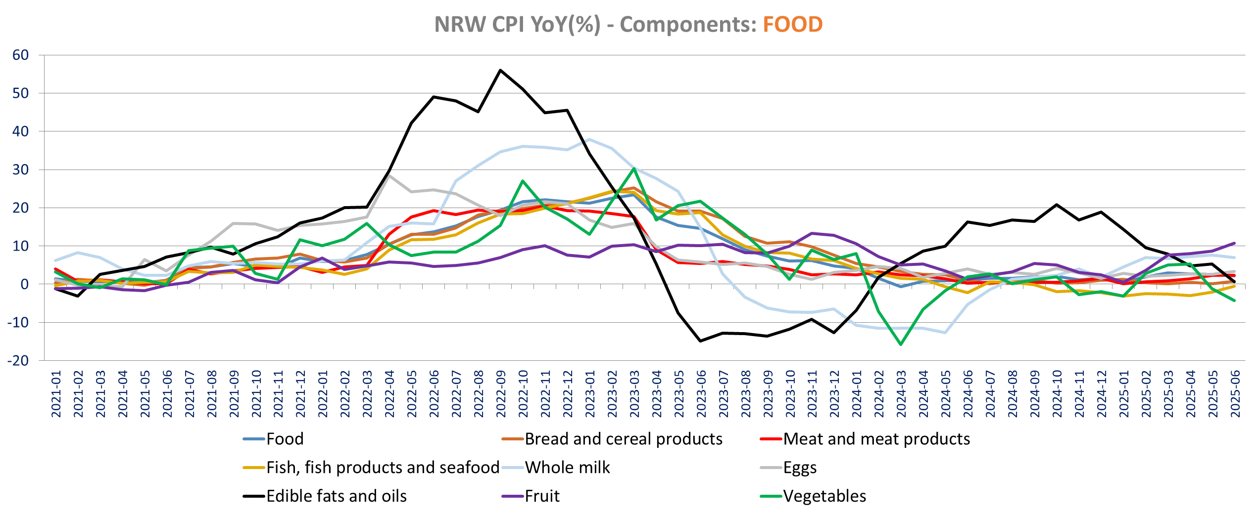 Food inflation increased to 3.05% from 2.7%. with unprocessed food inflation accelerating to 4.15% from 3.5%. Meat, fish, milk cheese, fruit (6.8% vs 4.3%) inflation is higher in June than in May, but vegetables inflation decreases to 1% from 1.7% and for oil & fats (-8.4% vs -7.6%).