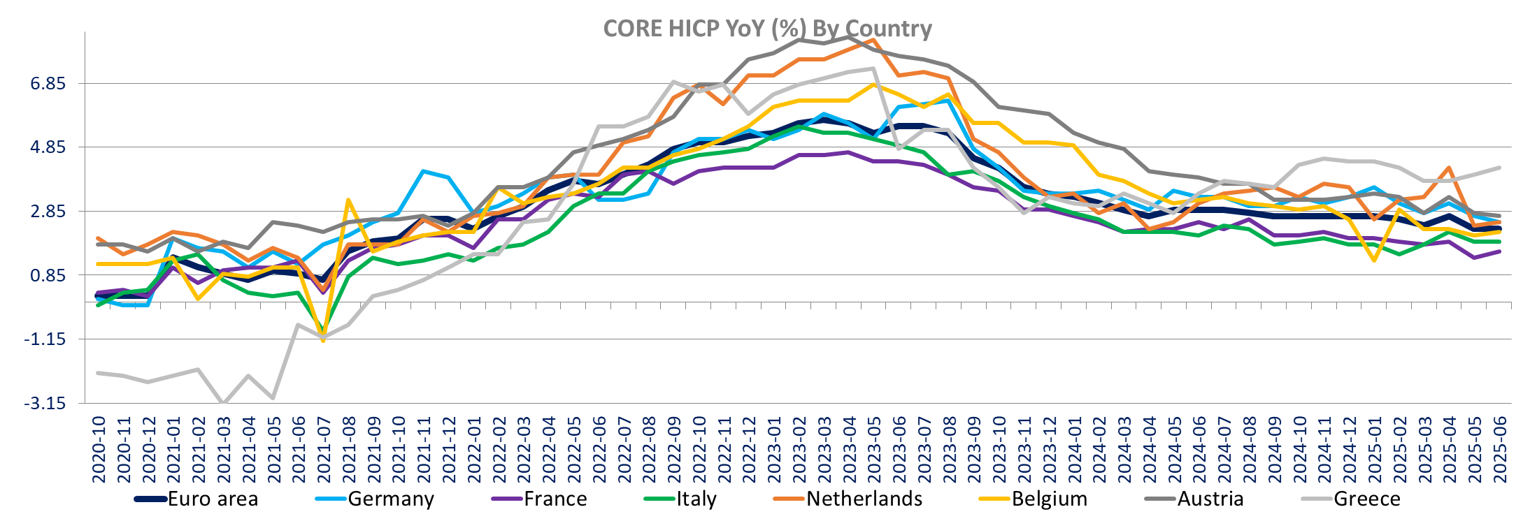 Core inflation is down in Germany and Croatia, unchanged in Italy and Finland, but up in France, The Netherlands, Belgium and Greece.