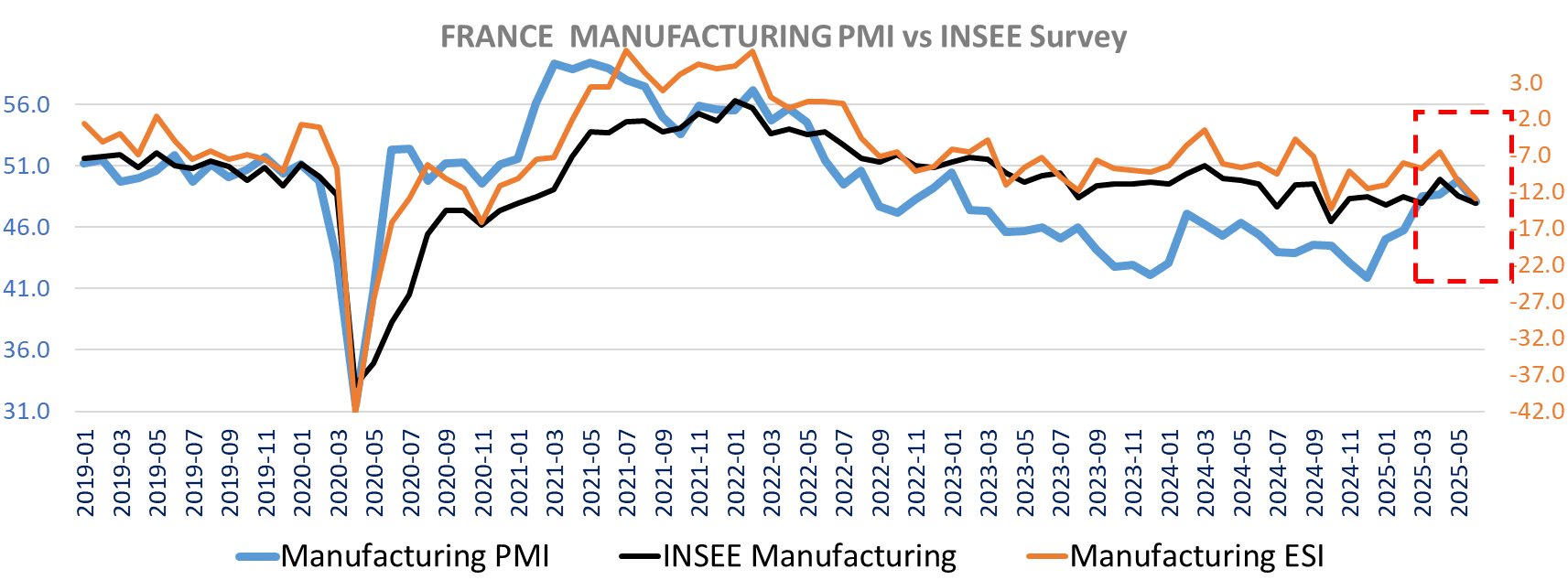 The ESI, PMI and INSEE all pointing south in June
