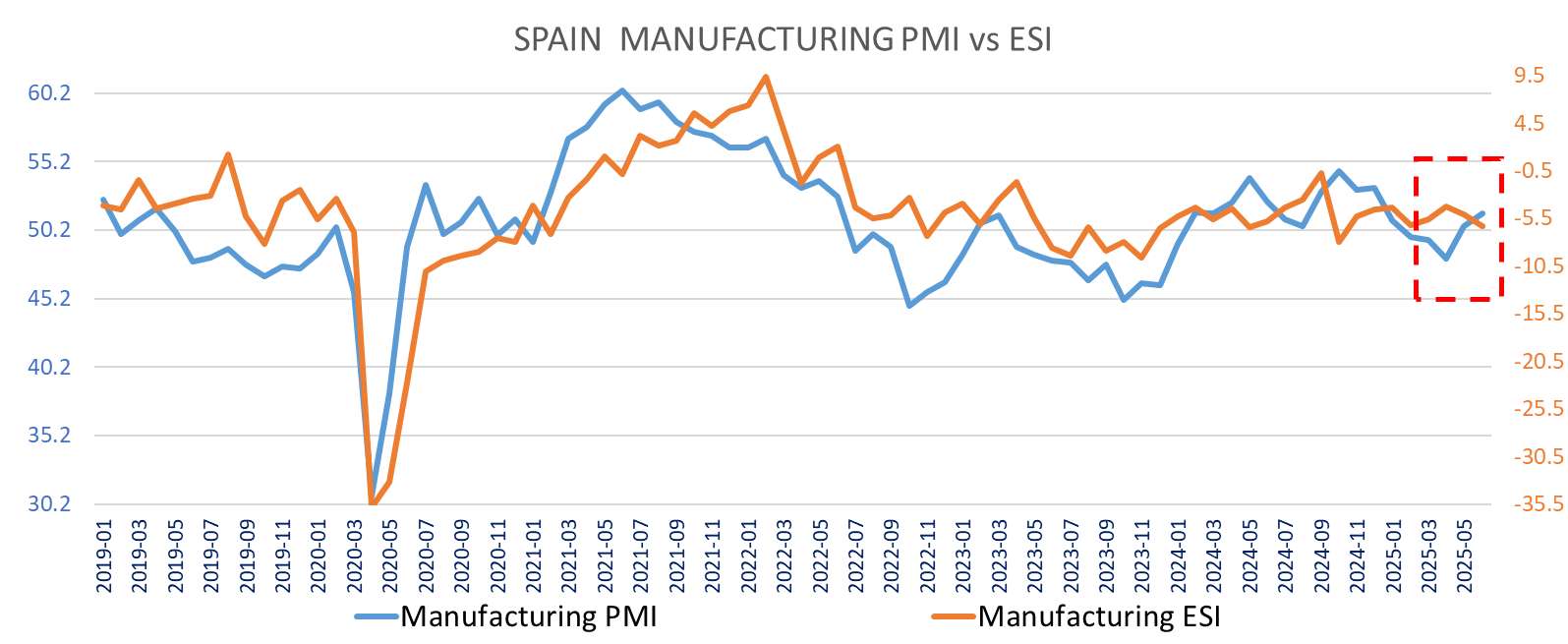 In Spain the ESI was slightly down not corroborating the sharp increase in PMI, but the ESI was up when the PMI fell earlier.