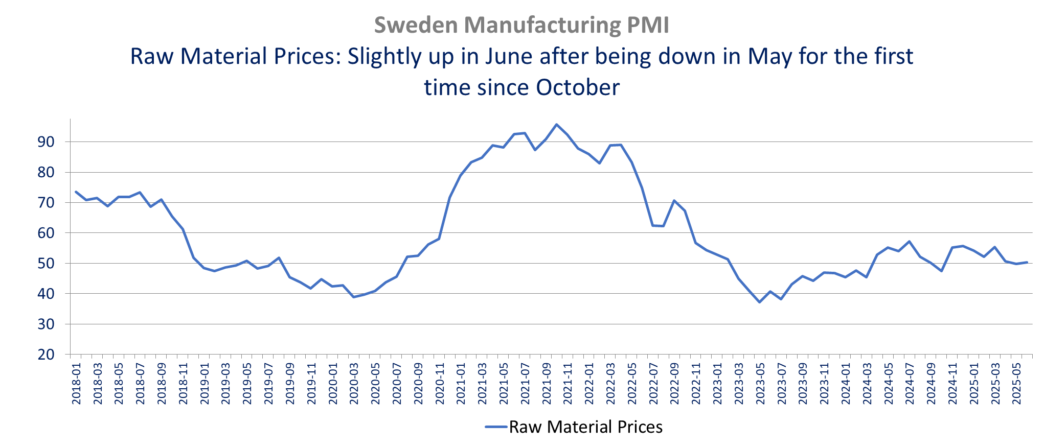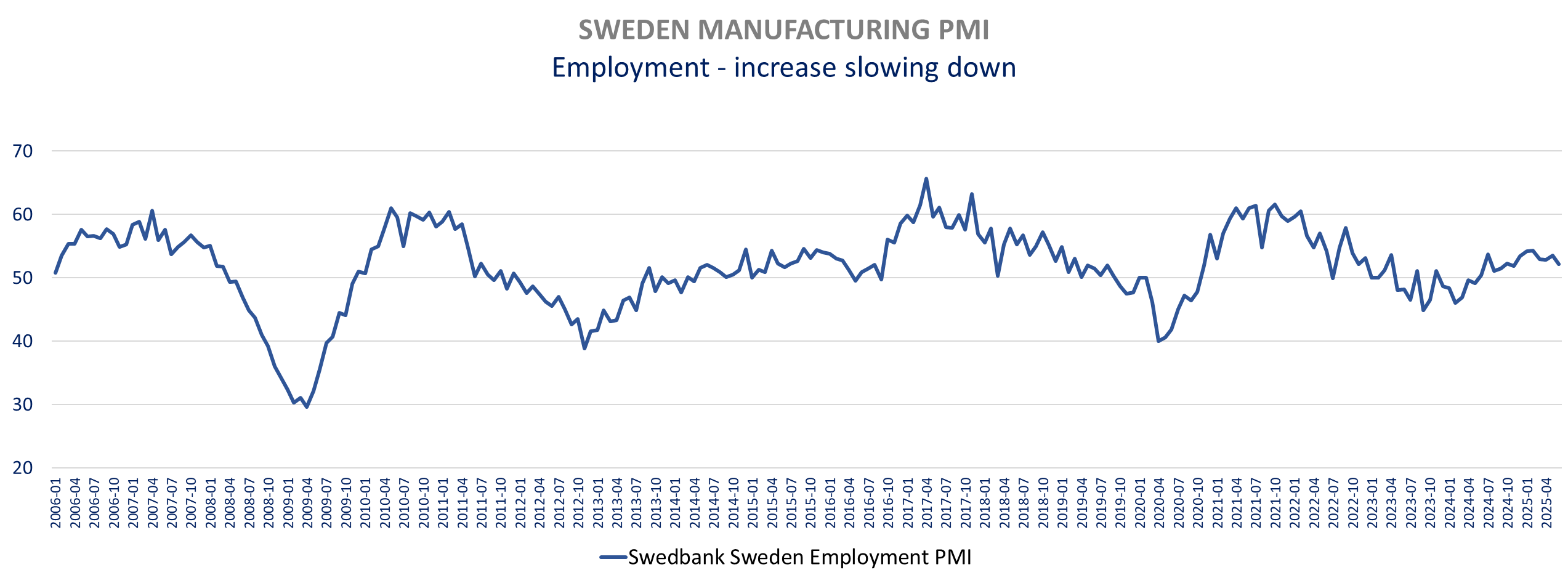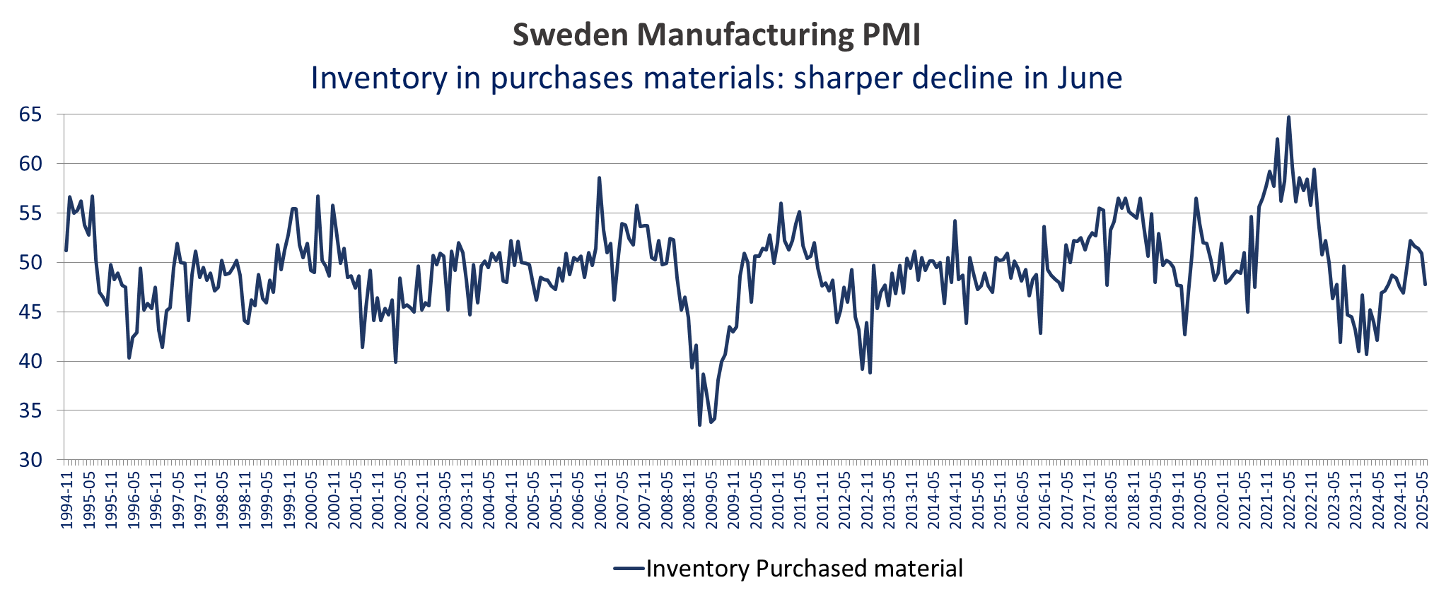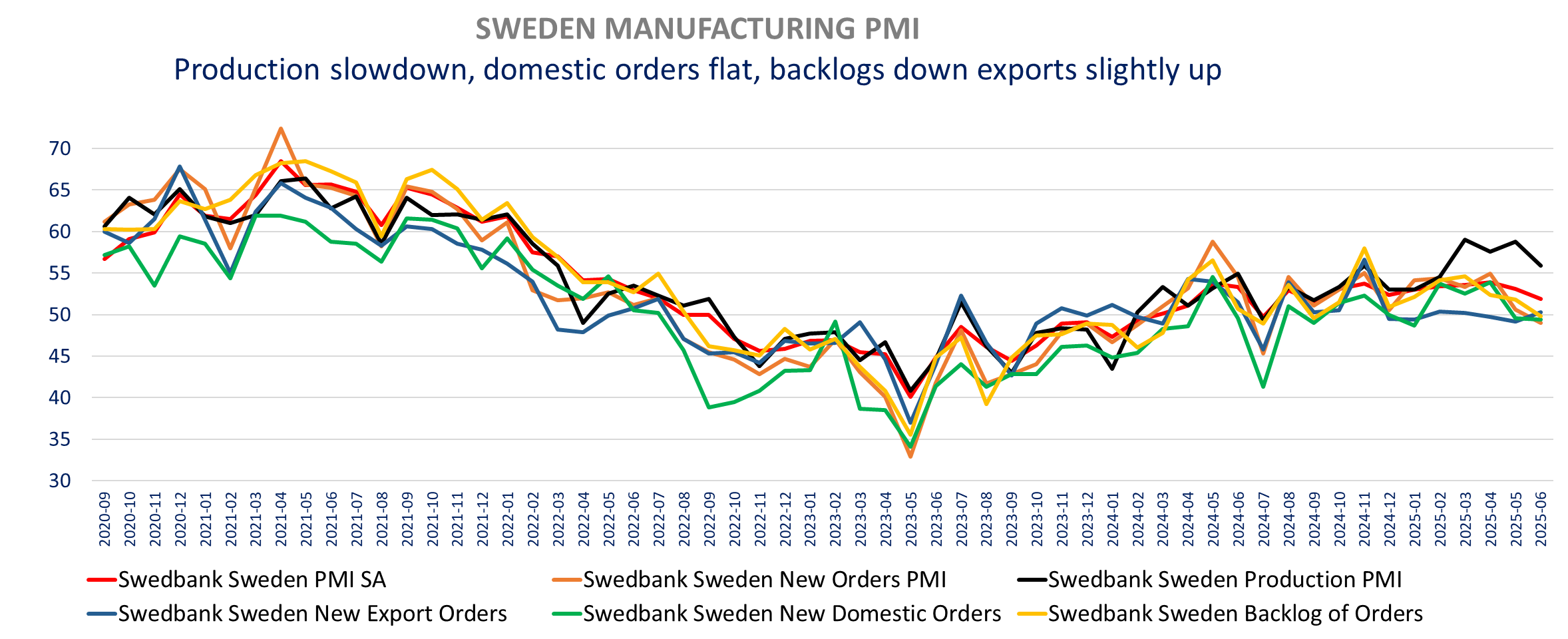 The Swedish manufacturing PMI was weak in June, with a significant growth slowdown, driven by weaker orders. It is the first decline in orders in 11 months (49 vs 50.6), dragged down by lower domestic demand while exports orders increased for the first time since March.