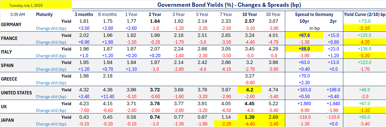 Bond yields are down and stocks weaker to start the second half. A lot of positives are priced in and hope for a positive reaction to the passage of now rather messy OBBB should be disappointed. Markets are also too positive on tariffs at this stage