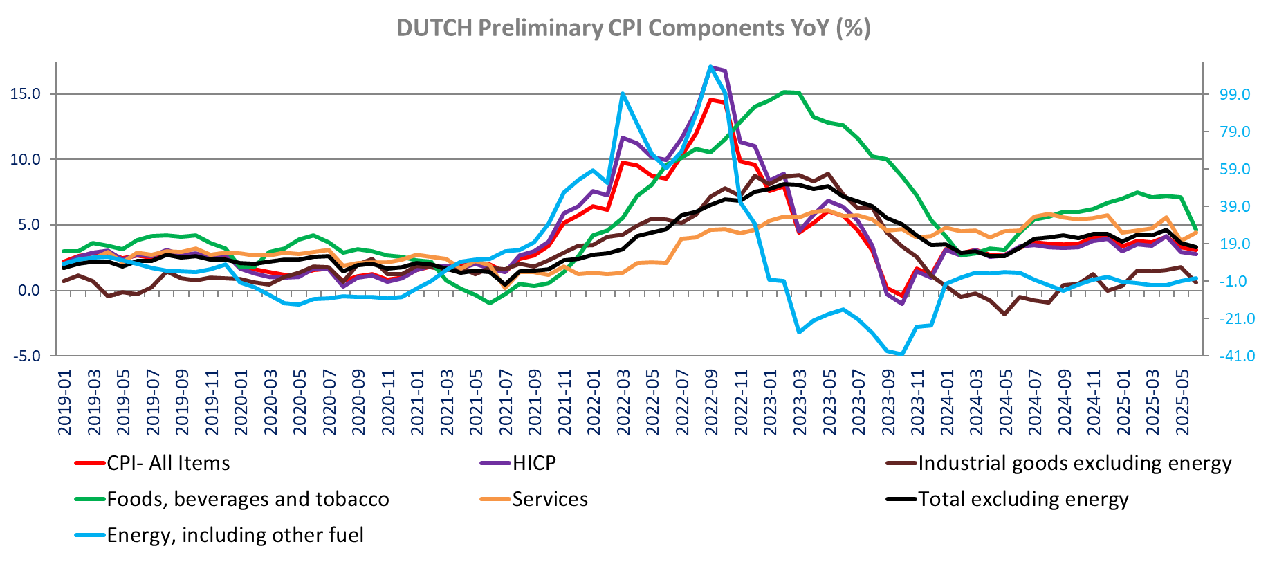 The June Dutch inflation (Preliminary) is down to its lowest in One year at 3.1% toy with prices unchanged month-over-month, down from 3.3% yoy in May, better than expectations. The HICP prices are also flat m/m bringing the annual rate of harmonized inflation to 2.8% down from 2.9%, the lowest rate since May 2024.