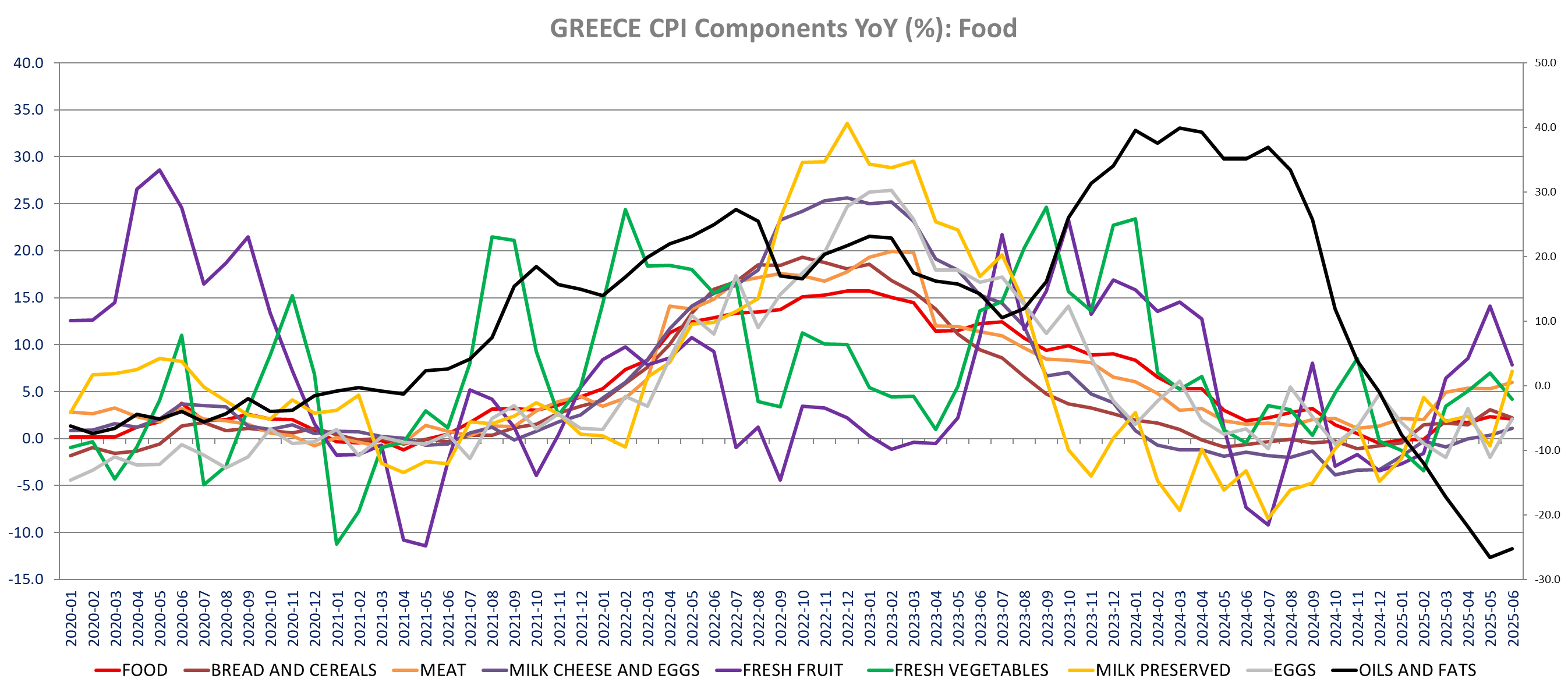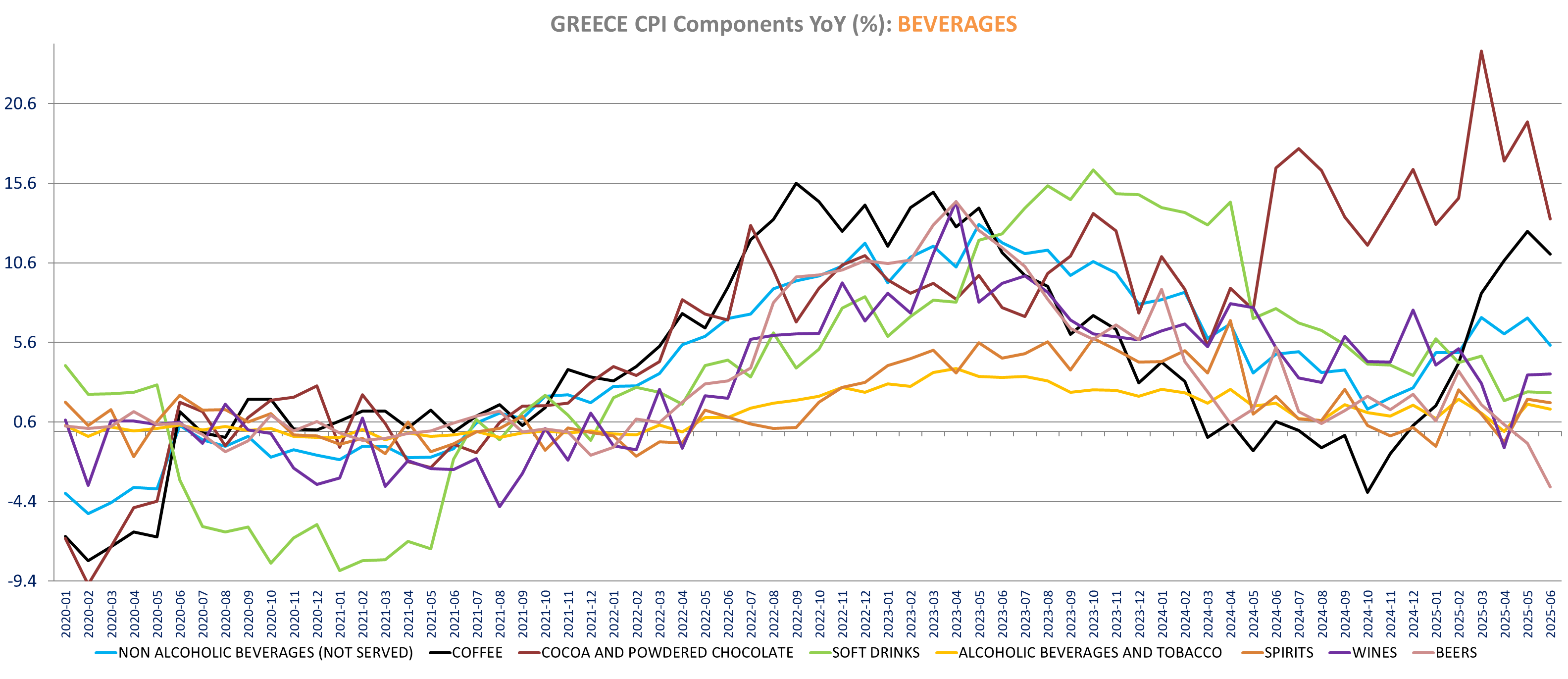 Greece, non-alcoholic beverages inflation fell in June to 5.4% yoy from 7.1% yoy in May as cocoa based drinks inflation feel sharply to 13.4% from 19.45% yoy in May (+1.75% m/m but high comparison of 7.2% m/m in June 2024). Coffee prices inflation also eased to 11.2% from 12.6% (-0.3% m/m). Soft drinks, mineral water and tea inflation also decreased Fruit Juice inflation also fell significantly (0% vs 4.8% yoy, -3.45% m/m).