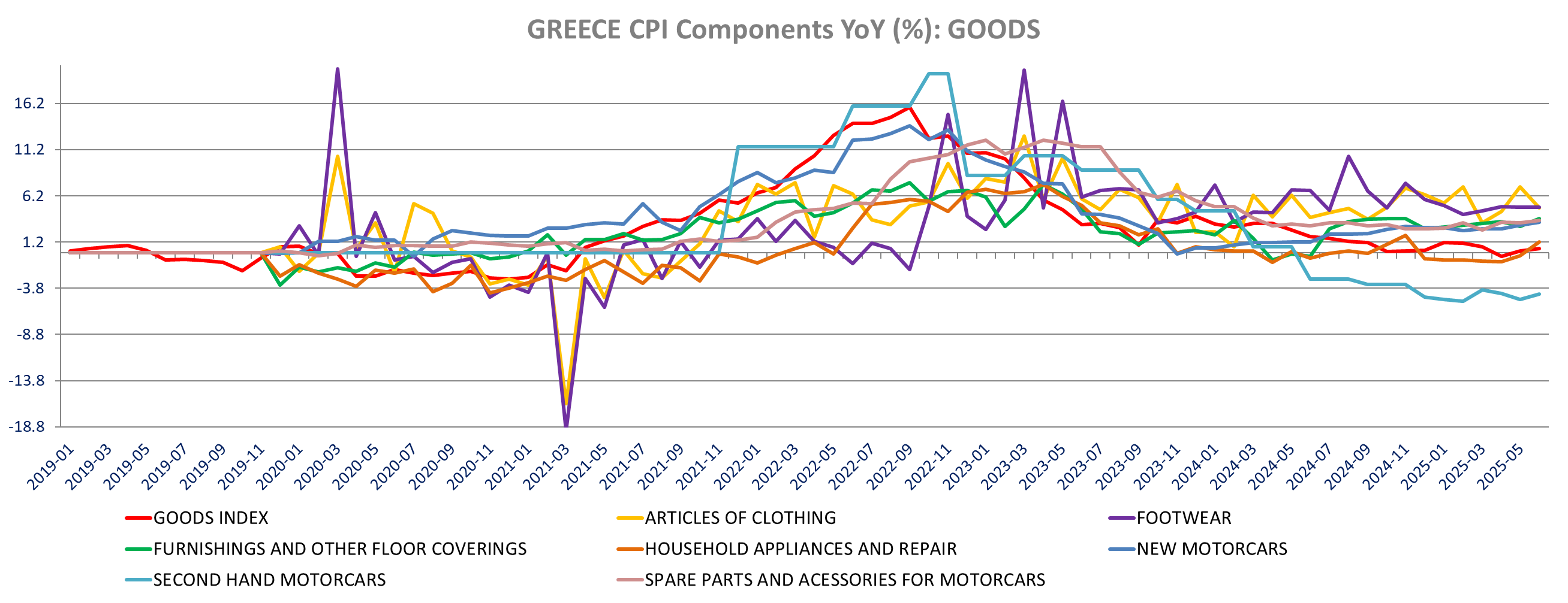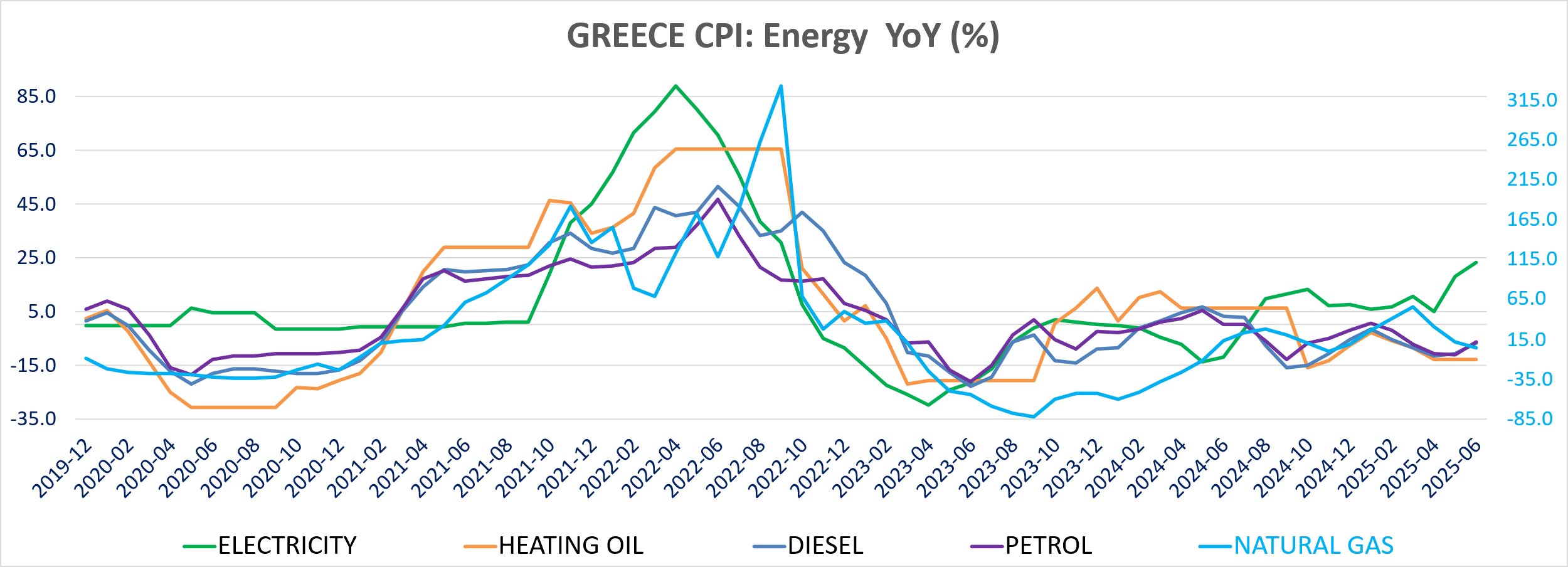 Energy inflation increased to 6.9% from 4.8% with electricity prices up 23.1% yoy in June (18% in May), increasing 3.6% m/m and liquid fuel & lubricants inflation increased to -5.95% toy from -10.2% yoy in May. Diesel prices are down -6.9% yoy in June versus -10.9% yoy in May (+2.6% m/m) and gasoline prices inflation is up to -6.6% yoy from -11% (+1.55% m/m). gas inflation eases to 3.9% from9.6% (-0.1% m/m and high comparison from 2024, +5.4% m/m).