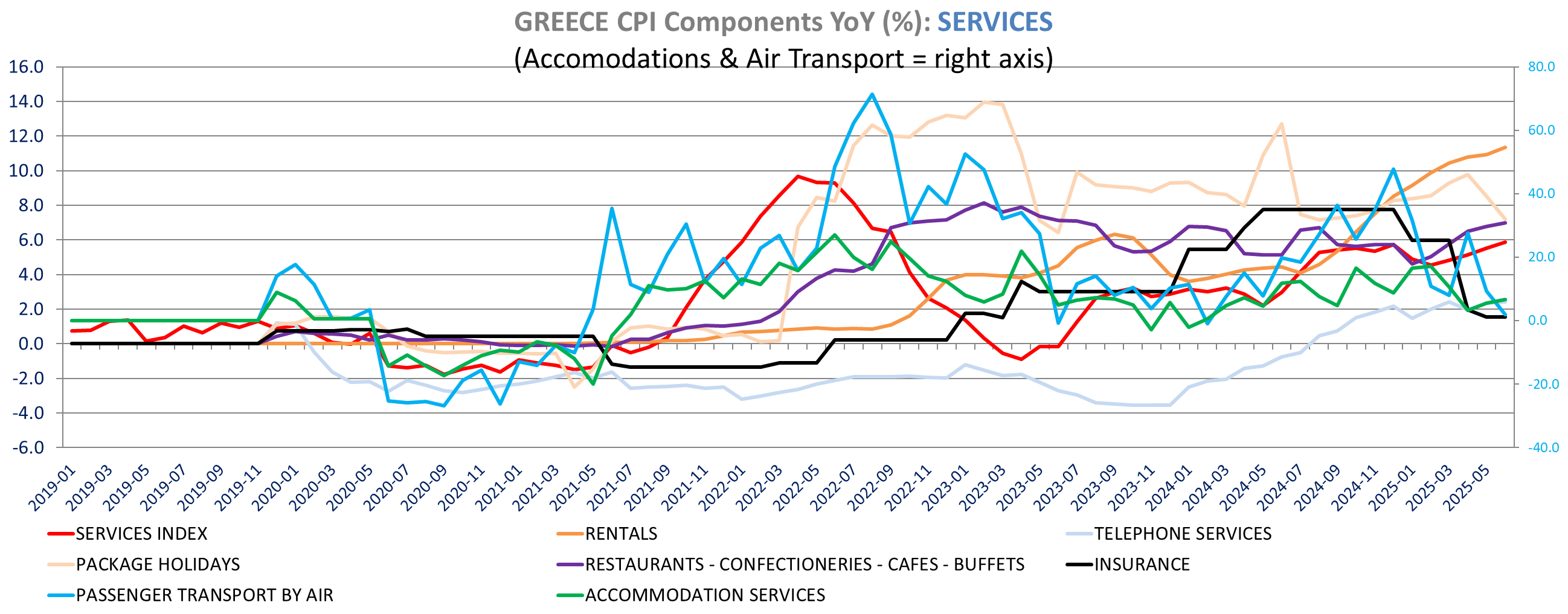 Services’ inflation increased to 5.9% yoy from 5.5%, up 1.1% m/m amid higher inflation for rentals, accommodation, restaurants, health services and social protection. Air transport and package holidays inflation is down in June.
