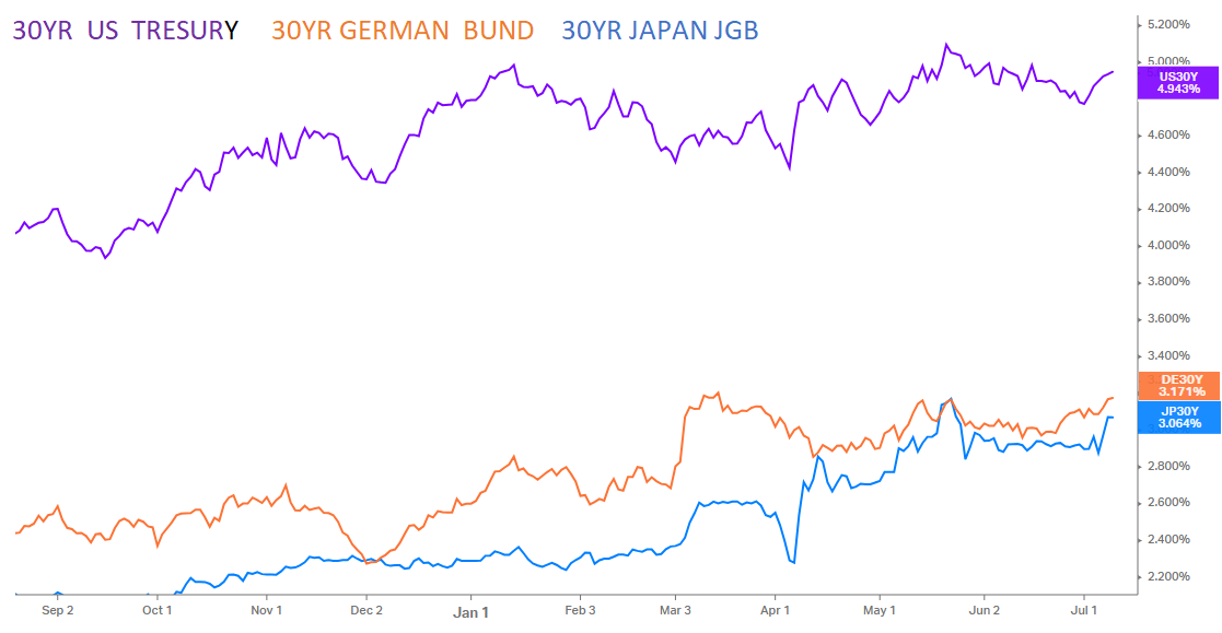 With a bare calendar for economic releases focus is on tariffs even if the July 9 deadline has shifted to August 1st. European stocks are taking the renewed tariffs’ threats in stride in hope of better settlement. A deal with the EU is still a long shot especially when digital taxes (or VAT) comes back into the mix. Japanese stocks are also up, the ¥ weaker but bond yields are climbing (10 yr JGB above 1.50% again).