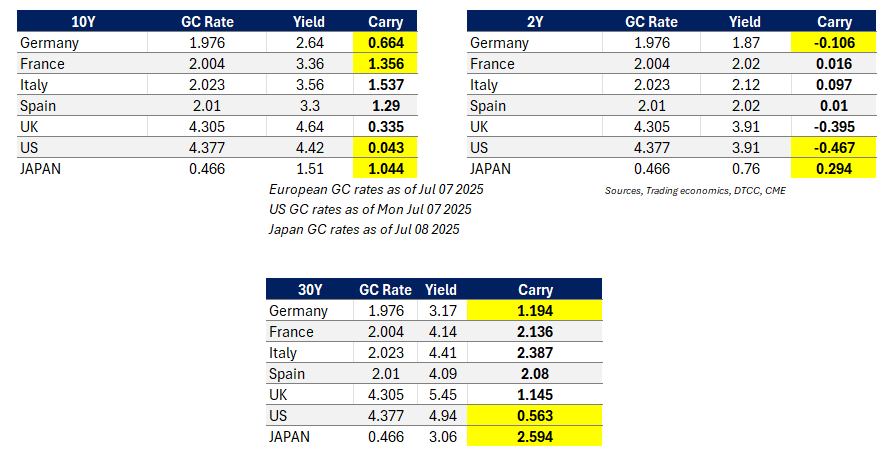 Carry to GC is back to slightly positive for the US 10yr (4bp) but far lower than peers with 104bp for JGB and 66bp for Germany. The US and UK 2yr prices rate cuts. The 30yr JGB carry back to the highest at 259bp vs 56bp for the US! Low incentives to move into US bonds.